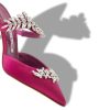 White satin pointed toe flat mules featuring embroidered gold cascading leaf design. Finished with flat stacked heel