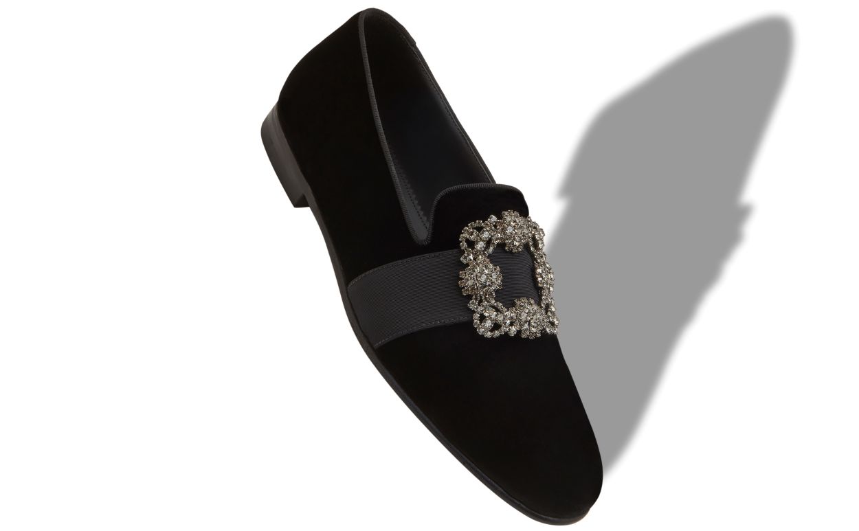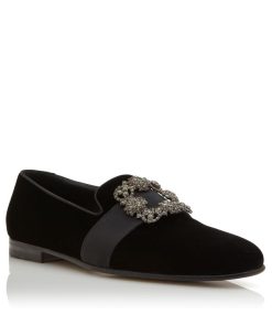 Black velvet loafers featuring grosgrain ribbon and square crystal buckle.Upper: 75% velvet, 15% viscose, 10% fabric. Sole: 95% calf leather, 5% rubber. Lining: 100% calf leather. Heel measures 10 mm. UK sizing. Made in Italy.