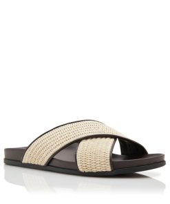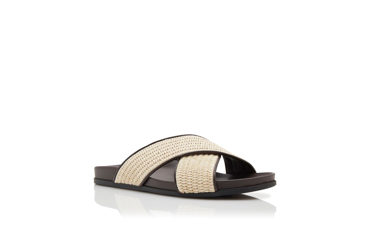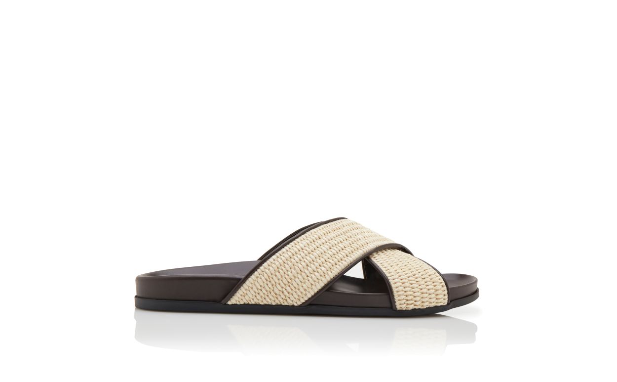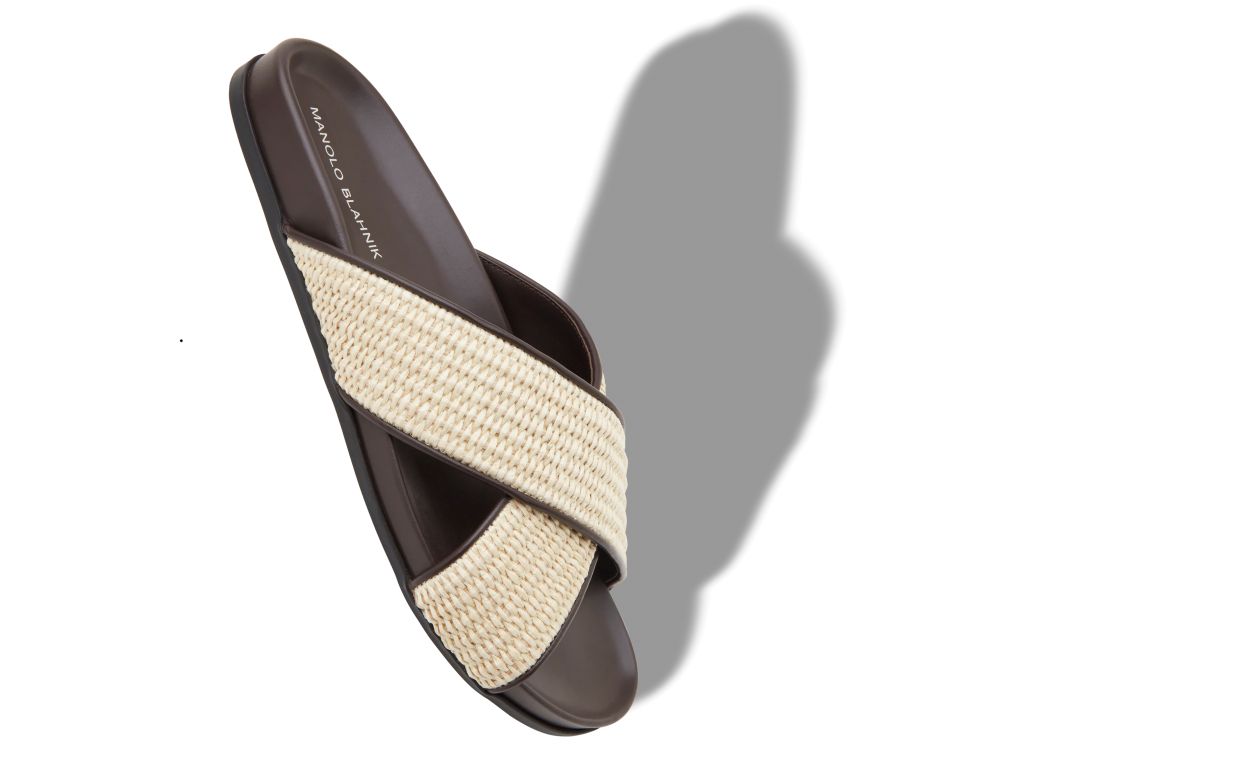 Brown natural weave open toe flat sandals featuring dark cream crossover straps and soft calf leather footbed. Finished with flat rubber sole.Upper: 80% natural fibre, 20% calf leather. Sole: 100% rubber. Lining: 100% calf leather. Heel measures 10 mm. UK sizing. Made in Italy.