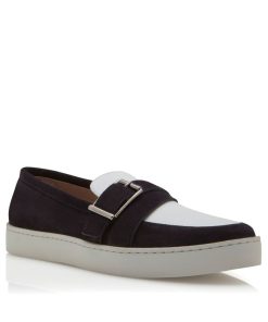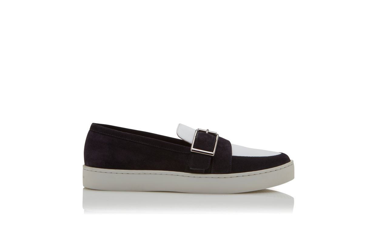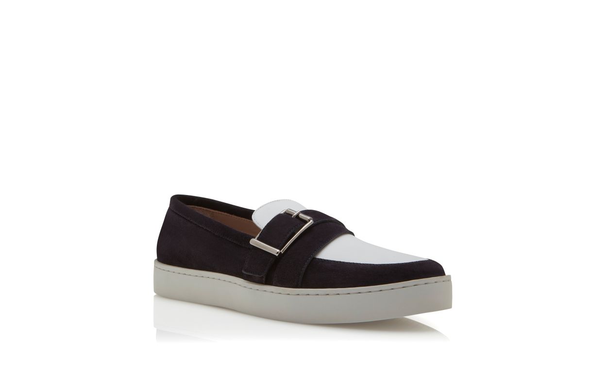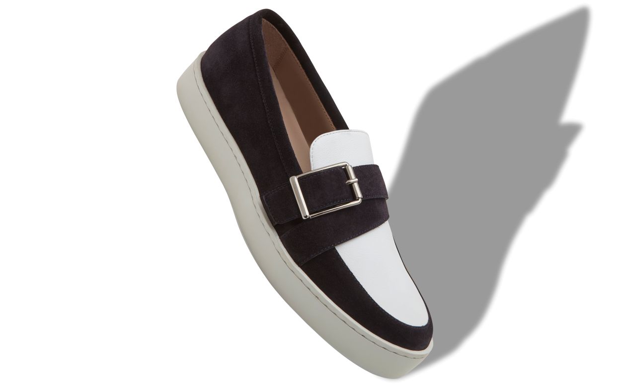 Navy blue and white suede loafers featuring slip-on design, decorative buckle detail and flat rubber sole.Upper: 100% calf suede. Sole: 100% rubber. Lining: 100% calf leather.Heel measures 10 mm.UK sizing.Made in Italy.