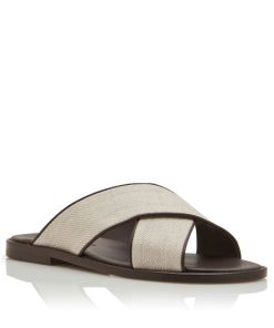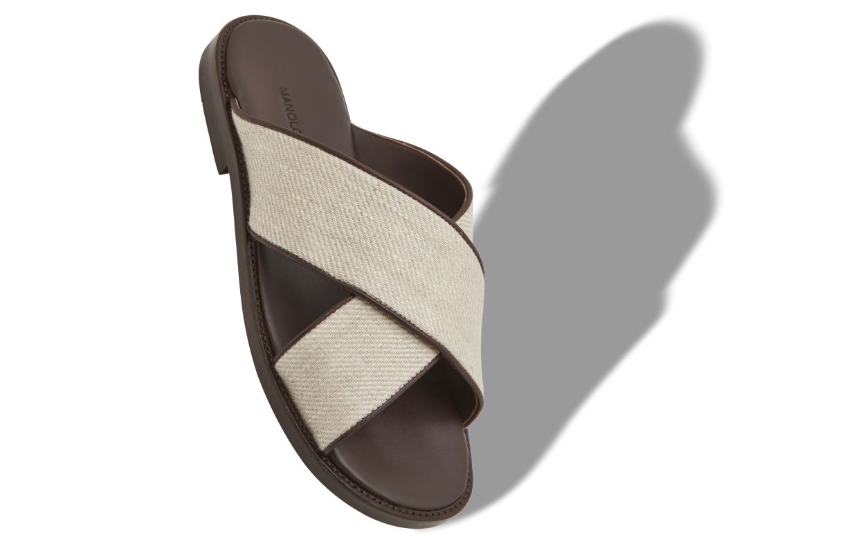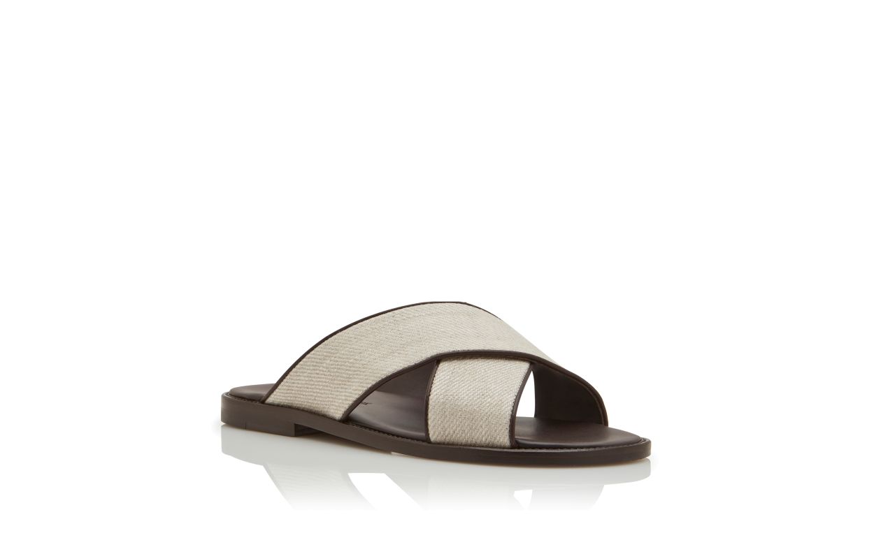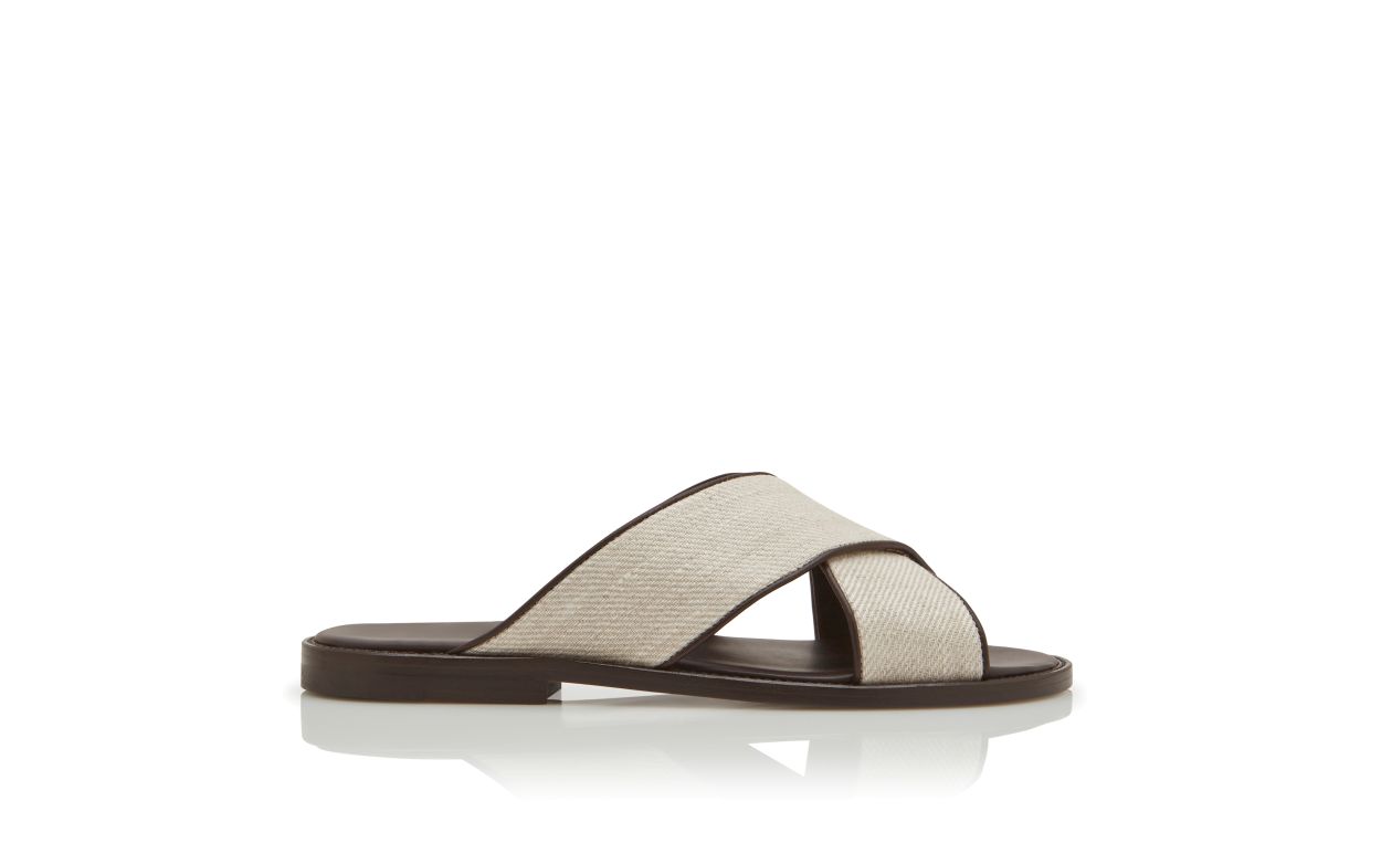 Cream linen sandals featuring crossover straps over instep and toe and calf leather edging. Upper: 90% linen, 10% calf leather. Sole: 95% calf leather, 5% rubber. Lining: 100% calf leather.Heel measures 10 mm.UK sizing.Made in Italy.