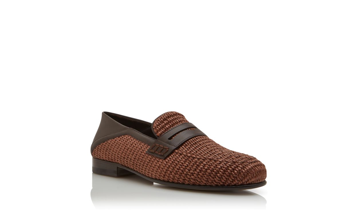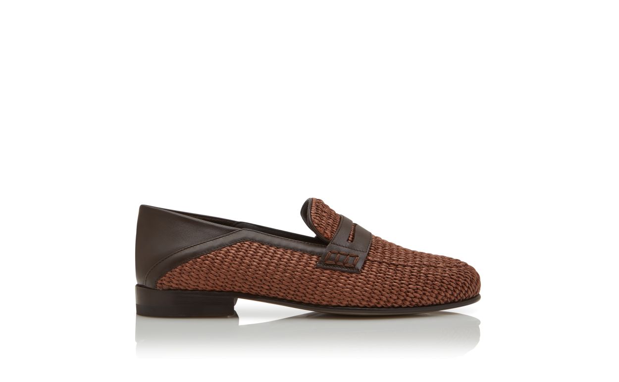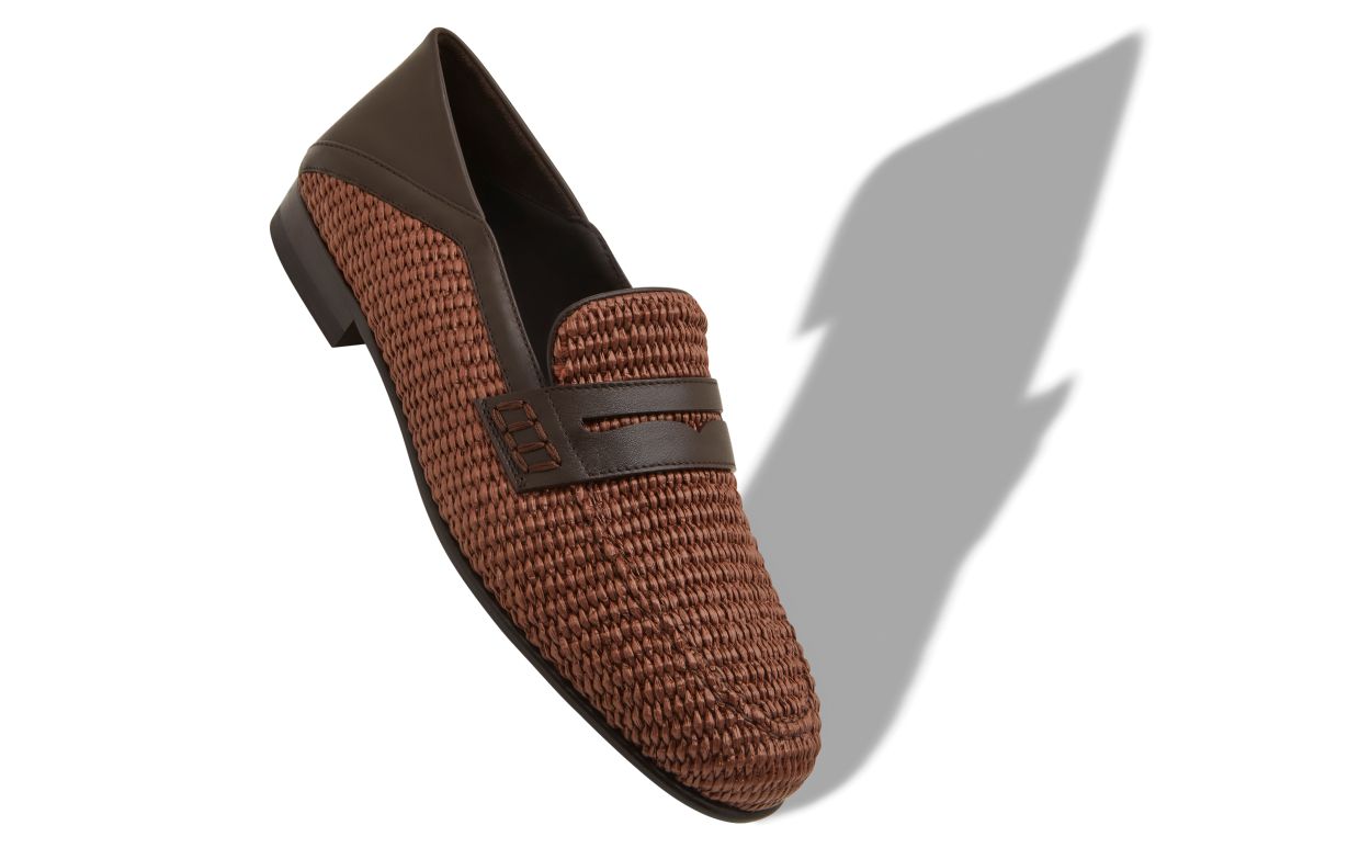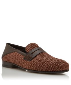 Dark brown raffia penny loafers featuring decorative penny keeper and tonal calf leather counter. Upper: 80% raffia, 20% calf leather. Sole: 100% calf leather. Lining: 100% calf leather.Heel measures 10 mm.UK sizing.Made in Italy.