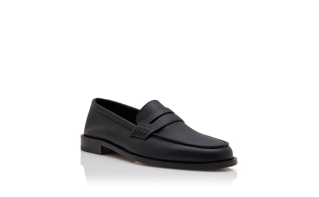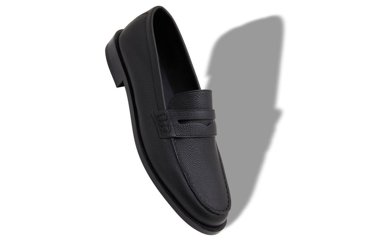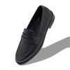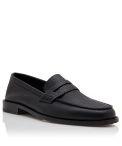 Black calf leather penny loafers featuring apron cut design with decorative penny keeper. Upper: 100% calf leather. Sole: 95% calf leather, 5% rubber. Lining: 100% calf leather. Heel measures 10 mm. UK sizing. Made in Italy.