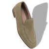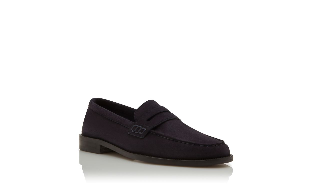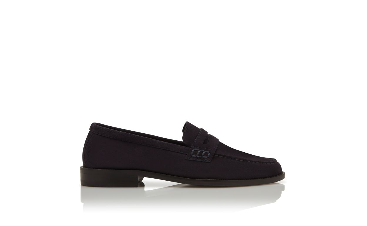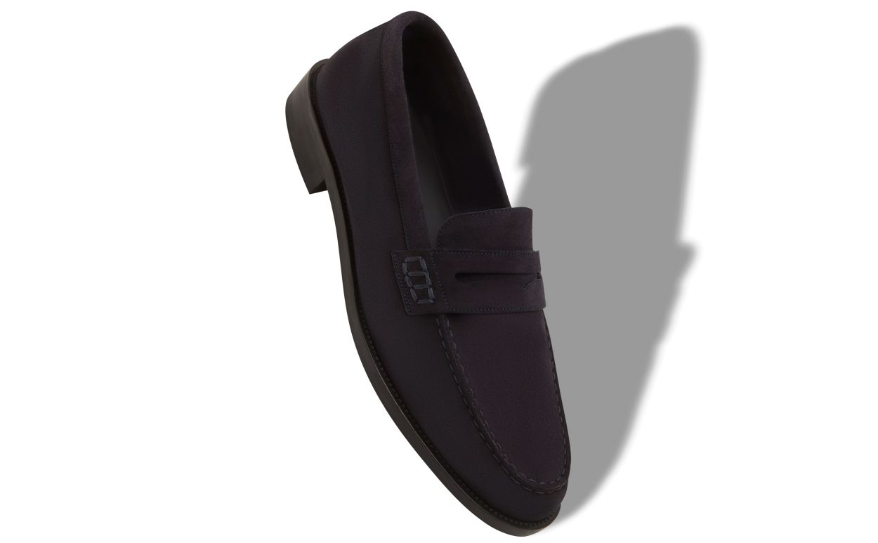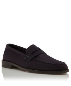 Navy blue suede penny loafers featuring apron cut design and decorative penny keeper with stitch detail.Upper: 100% calf suede. Sole: 95% calf leather, 5% rubber. Lining: Unlined. Heel measures 10 mm. UK sizing. Made in Italy.