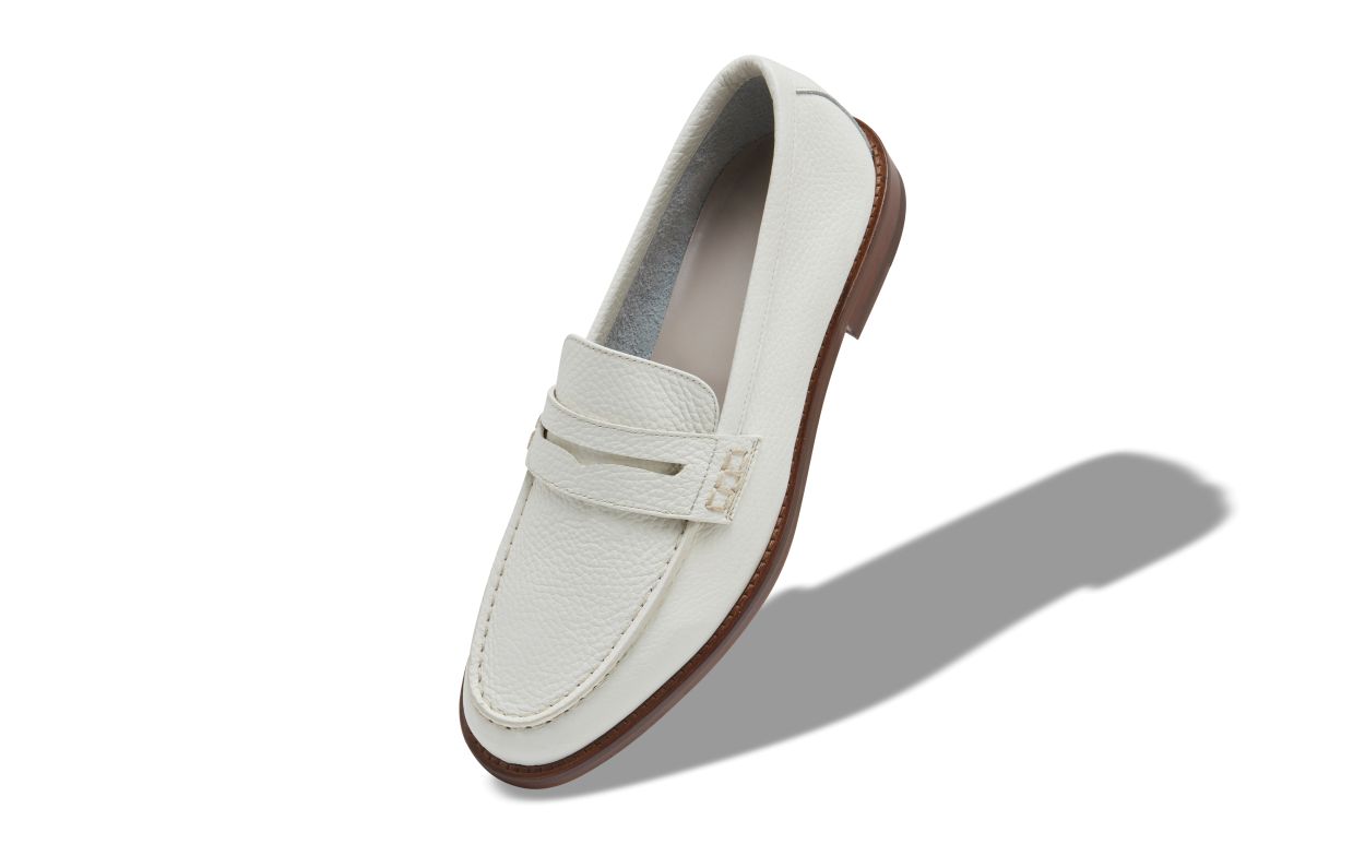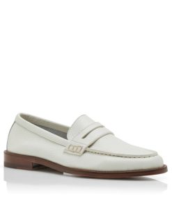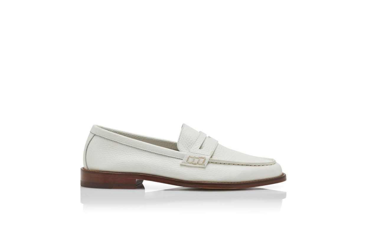 White calf leather penny loafers featuring an apron cut design with a decorative penny keeper.Upper: 100% calf leather. Sole: 100% cow leather. Lining: 100% kid leather. Heel measures 10 mm. UK sizing. Made in Italy.