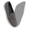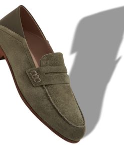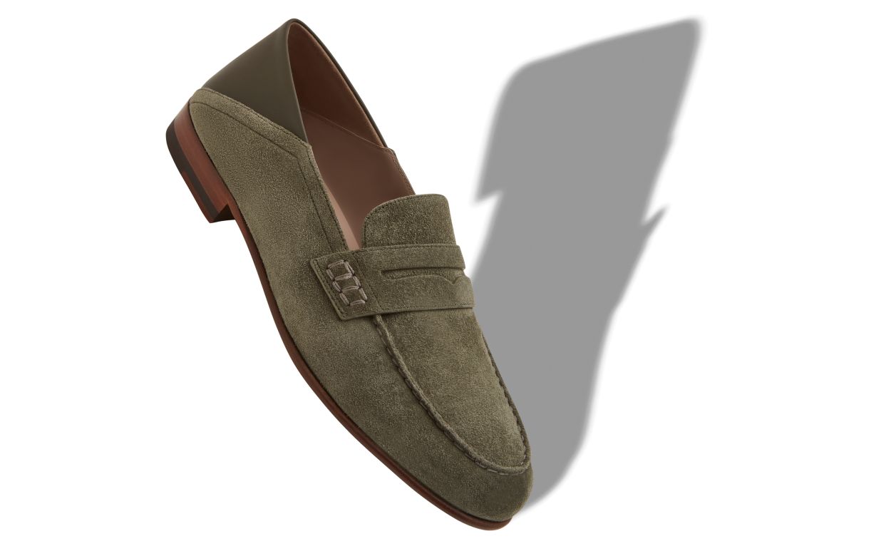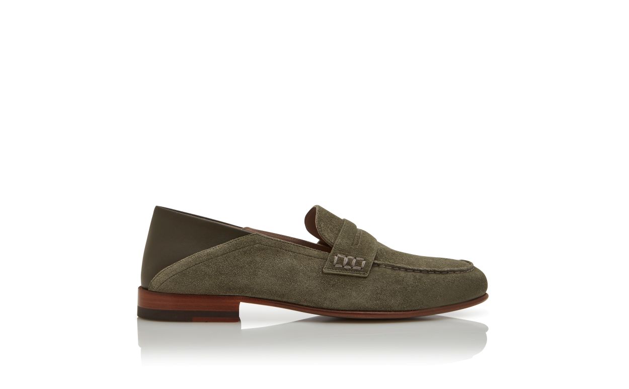 Khaki suede penny loafers featuring apron cut design with decorative penny keeper and tonal calf leather counter.Upper: 80% calf suede, 20% calf leather. Sole: 95% calf leather, 5% rubber. Lining: 100% calf leather.Heel measures 10 mm.UK sizing.Made in Italy.