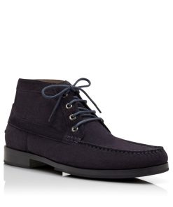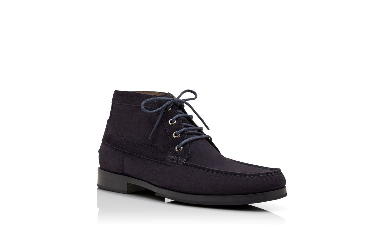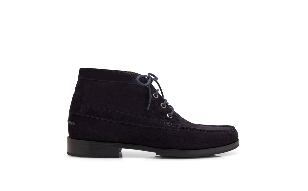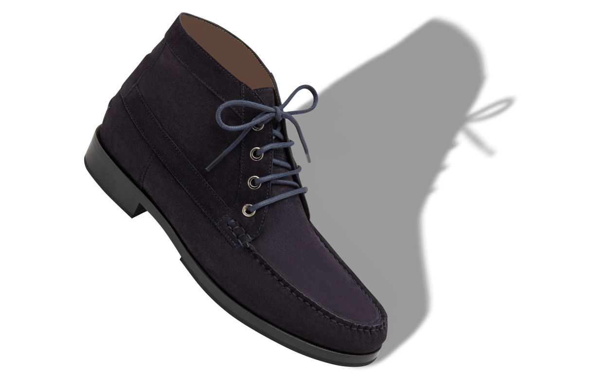 Navy blue calf suede ankle boots featuring lace-up closure and black rubber sole. Upper: 100% calf suede. Sole: 80% rubber, 20% calf leather. Lining: 100% calf leather.Heel measures 10 mm.UK sizing.Made in Italy.