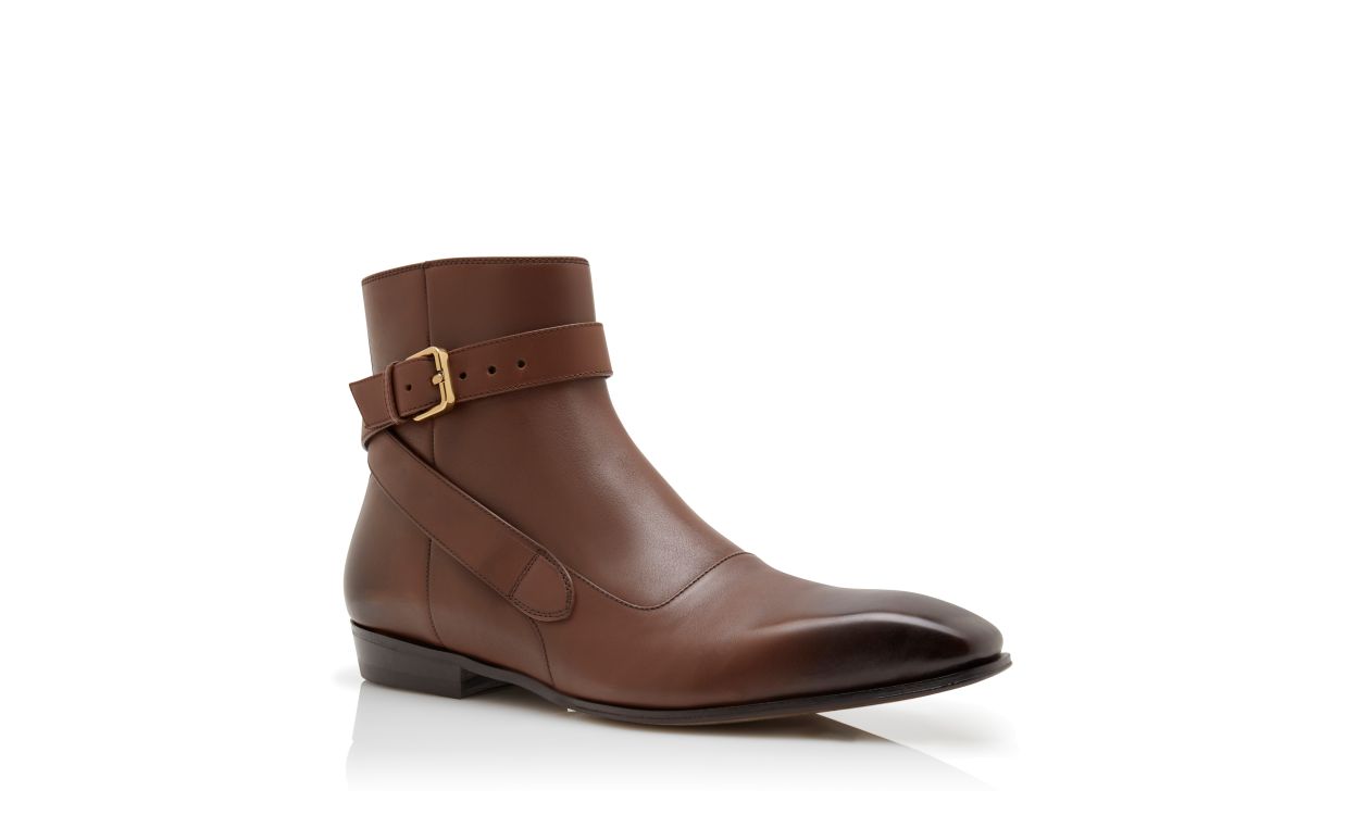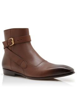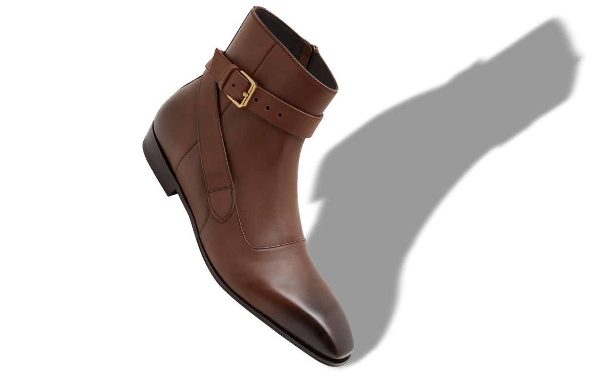 Brown calf leather ankle boots featuring gold buckle design detail and side zip closure. Upper: 100% calf leather. Sole: 95% calf leather, 5% rubber. Lining: 100% calf leather. Heel measures 10 mm. UK sizing. Made in Italy.