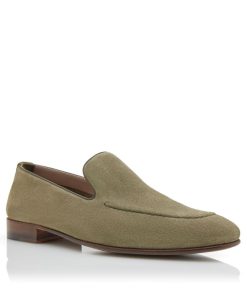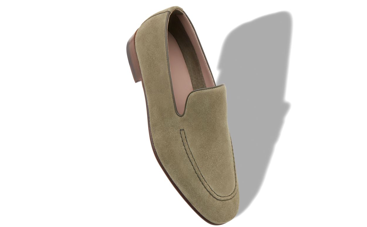 Khaki suede loafers featuring tonal calf leather edging details.Upper: 100% calf suede. Sole: 95% calf leather, 5% rubber. Lining: Unlined. Heel measures 10 mm. UK sizing. Made in Italy.