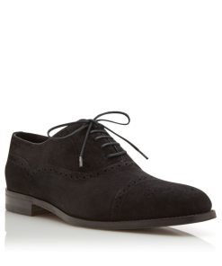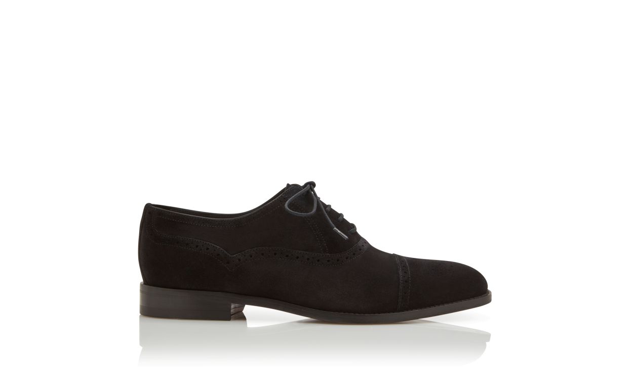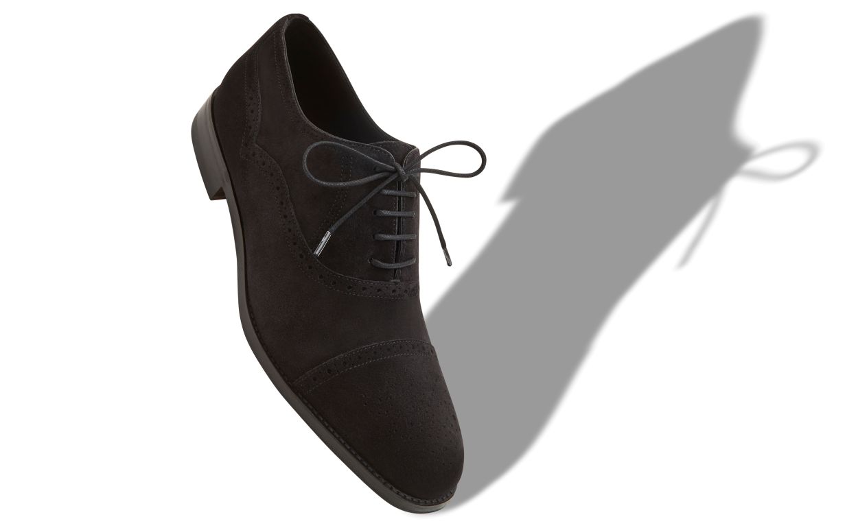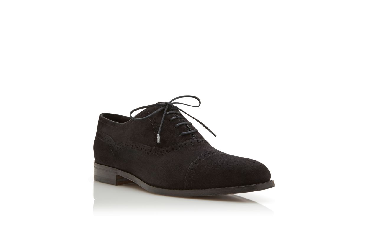 Black suede Oxfords featuring cap toe design with full broguing details and waxed cotton laces. Upper: 100% calf suede. Sole: 95% calf leather, 5% rubber. Lining: 100% calf leather. Heel measures 10 mm. UK sizing. Made in Italy.