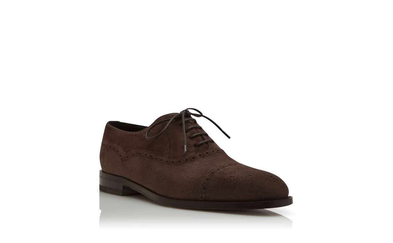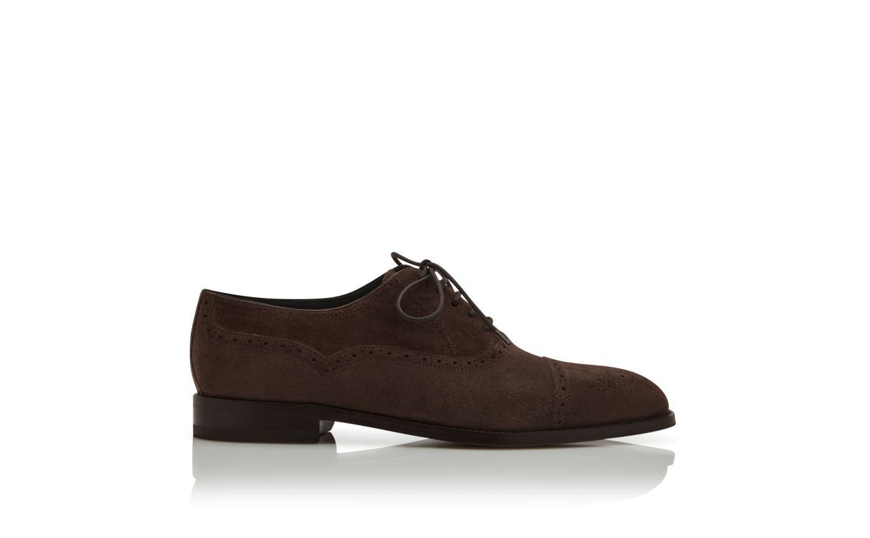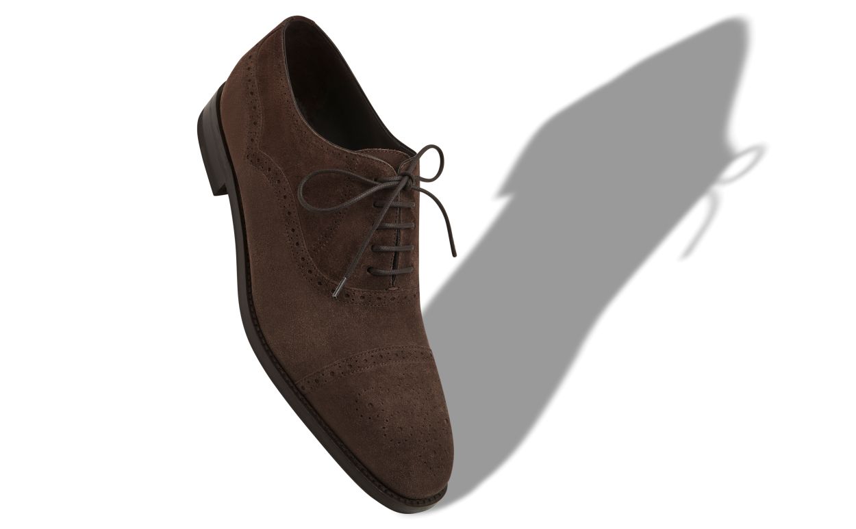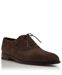 Dark brown suede Oxfords featuring cap toe design with full broguing details and waxed cotton laces. Upper: 100% calf suede. Sole: 95% calf leather, 5% rubber. Lining: 100% calf leather. Heel measures 10 mm. UK sizing. Made in Italy.