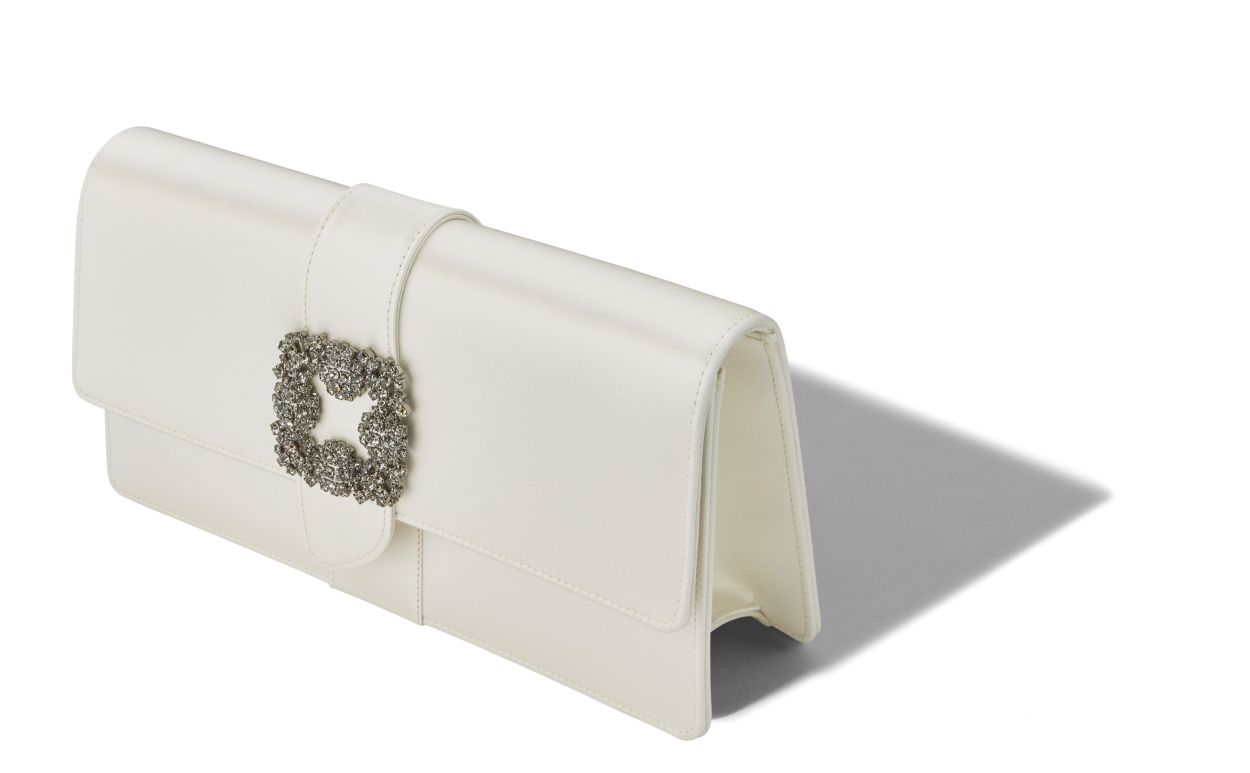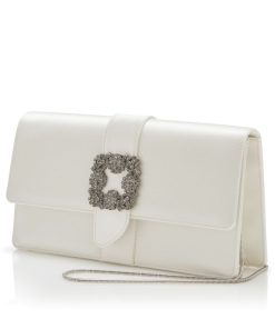 Off-white satin rectangular clutch bag featuring flap-over design and crystal buckle. Contains internal compartment, mirror and removable chains with two length options. Magnetic closure. Outer: 68% viscose, 32% silk. Lining: 68% viscose, 32% silk. Made in Italy. Height: 12 cm Length: 24 cm Width: 6 cm. Straps measure 37 cm and 110 cm.