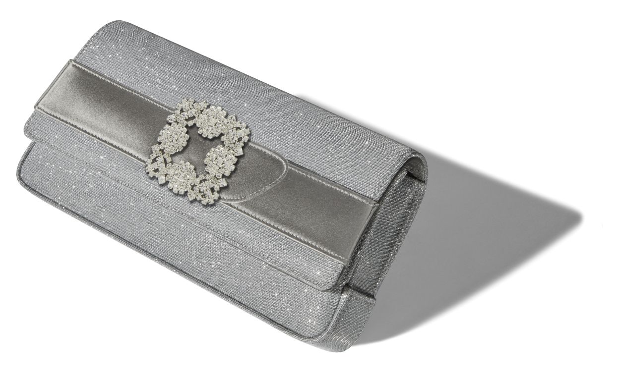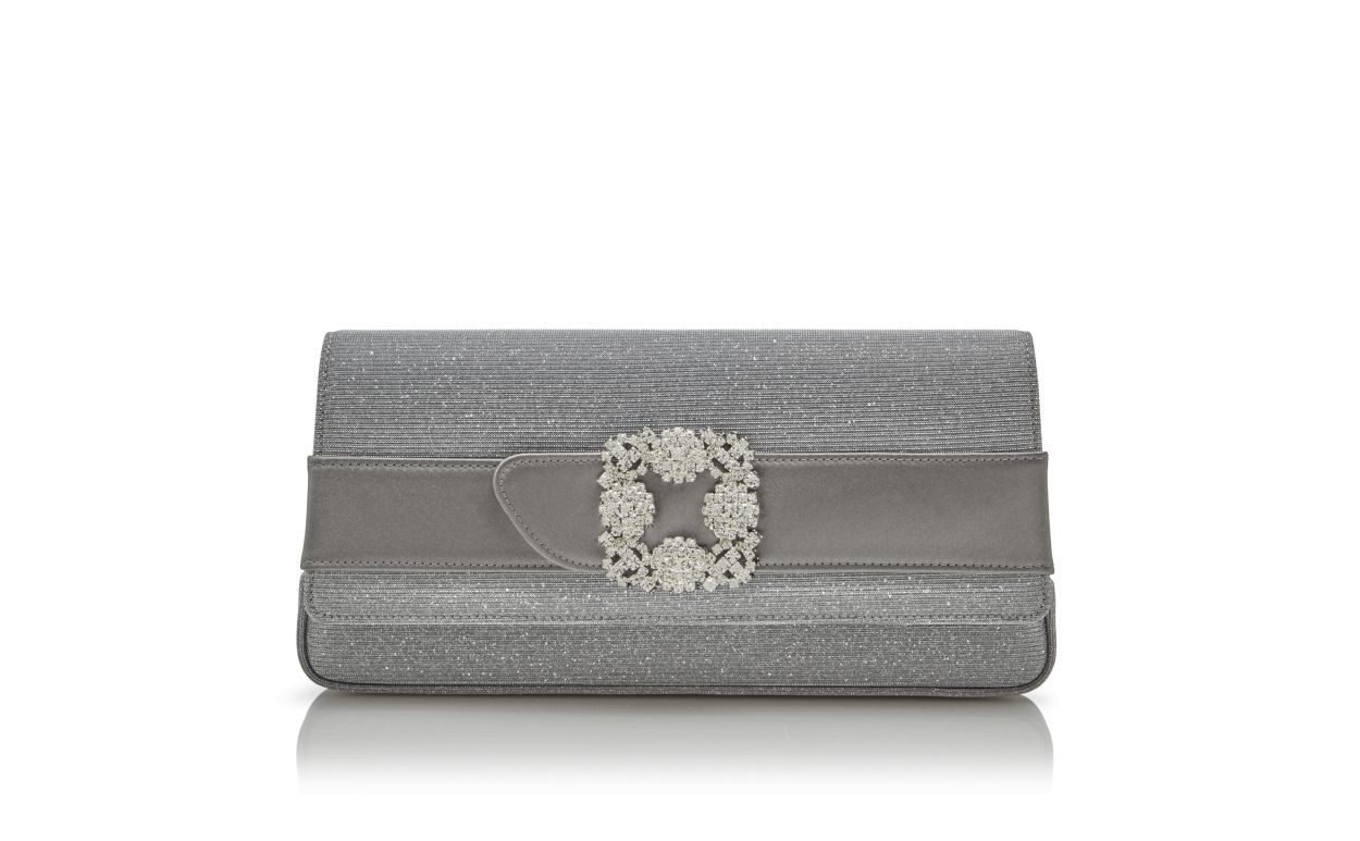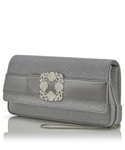 Silver glitter fabric rectangular clutch bag featuring flap-over design and crystal buckle. Contains internal zipped compartment, mirror and removable chains with two length options. Magnetic closure. Outer: 100% cotton blend fabric. Lining: 68% viscose, 32% silk. Made in Italy. Height: 12 cm Length: 24 cm Width: 3 cm. Straps measure 37 cm and 110 cm.