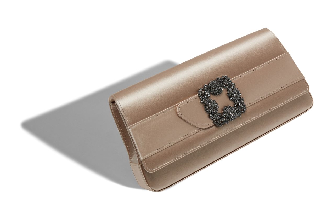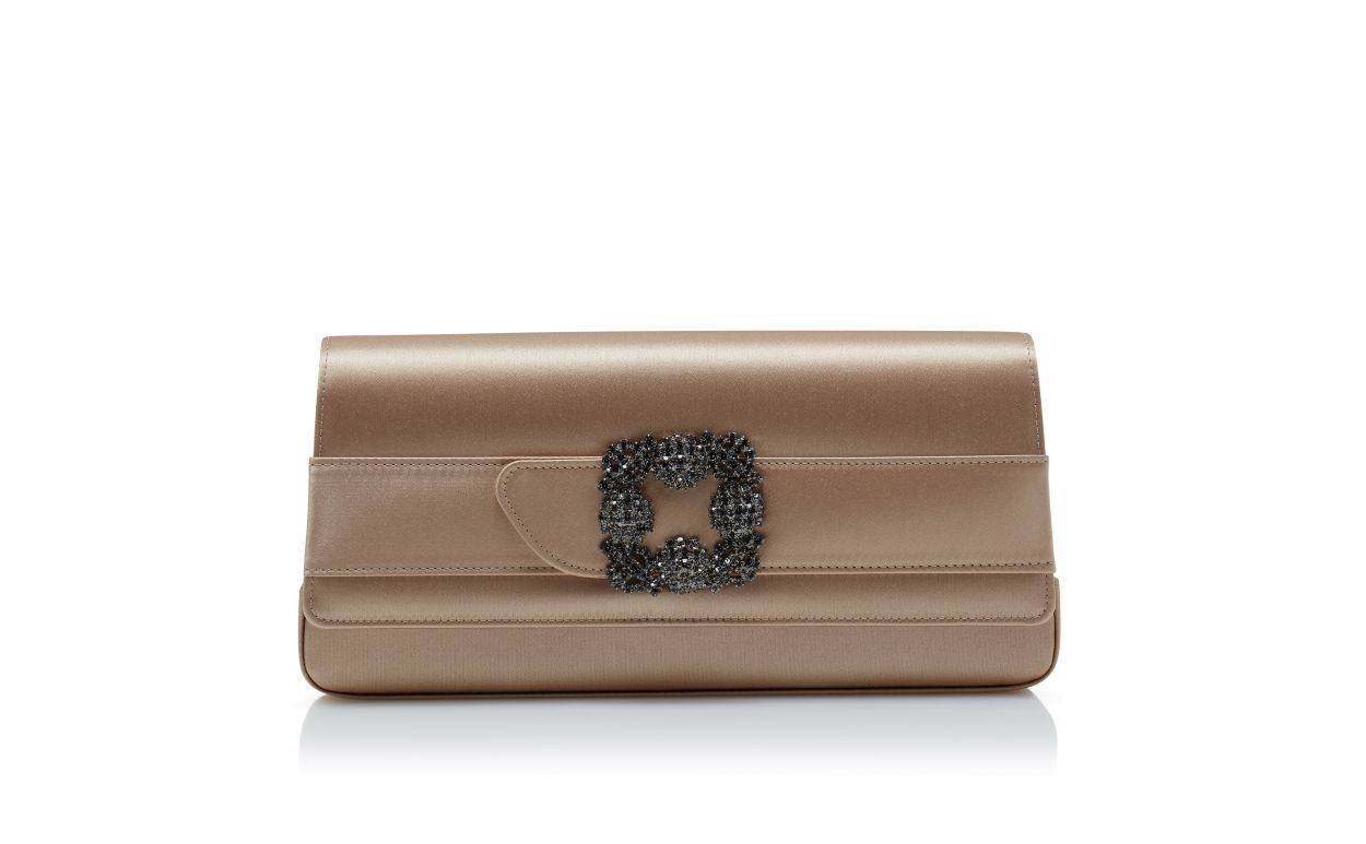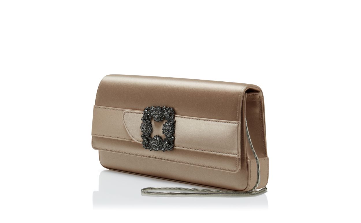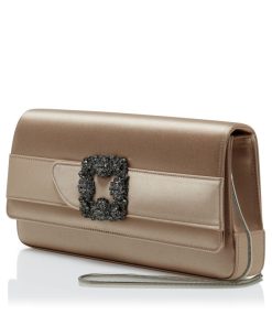 Light beige satin rectangular clutch bag featuring flap-over design and crystal buckle. Contains an internal zipped compartment, mirror and removable chains with two length options. Magnetic closure. Outer: 68% viscose, 32% silk. Lining: 68% viscose, 32% silk. Made in Italy. Height: 12 cm Length: 24 cm Width: 3 cm. Straps measure 37 cm and 110 cm.