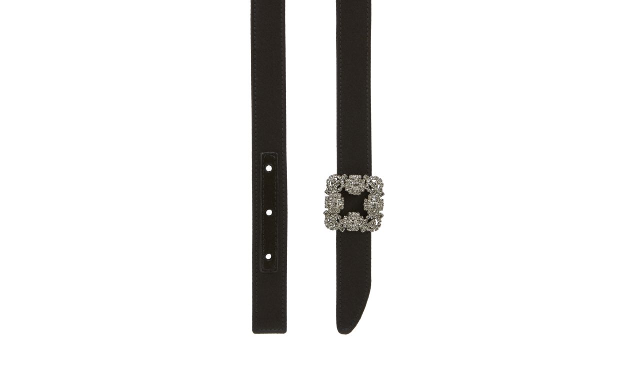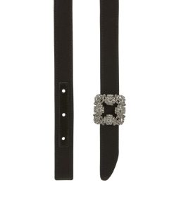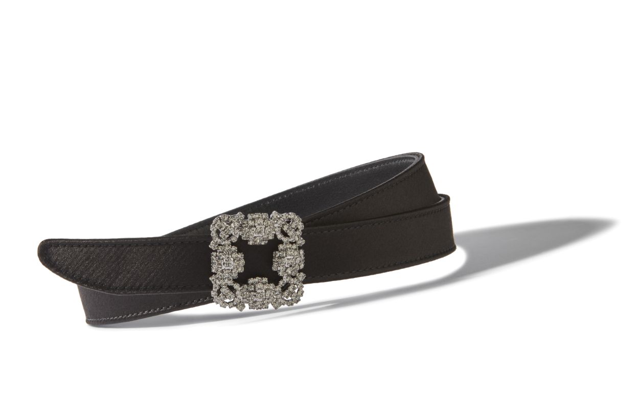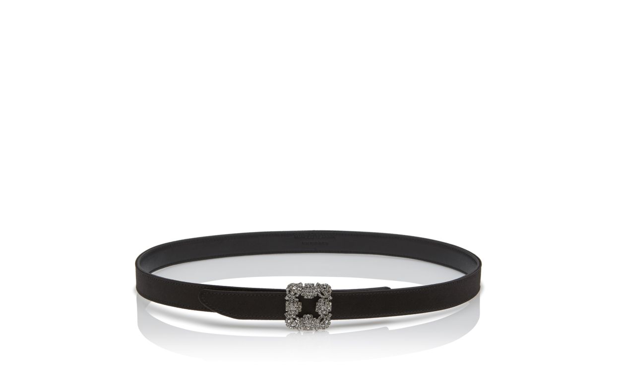 Black satin belt featuring narrow width design a moveable square crystal buckle encased in a gunmetal frame with push stud fastening. Upper: 68% viscose, 32% silk. Lining: 100% nappa leather. Made in Italy.