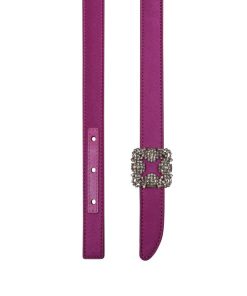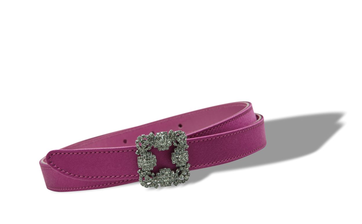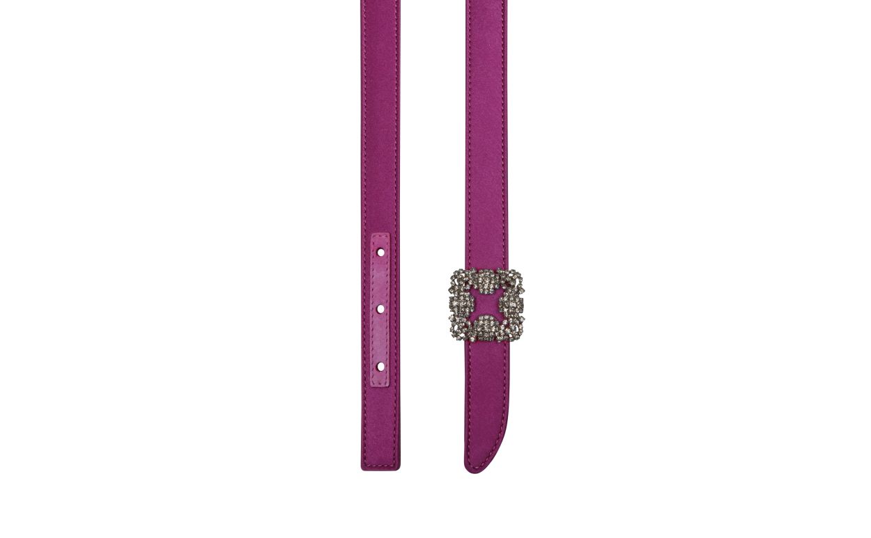 Dark fuchsia satin belt featuring narrow width design, moveable square crystal buckle encased in a gunmetal frame and push stud fastening. Upper: 68% viscose, 32% silk. Lining: 100% nappa leather. Made in Italy.
