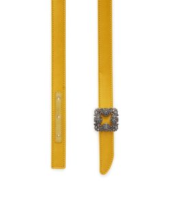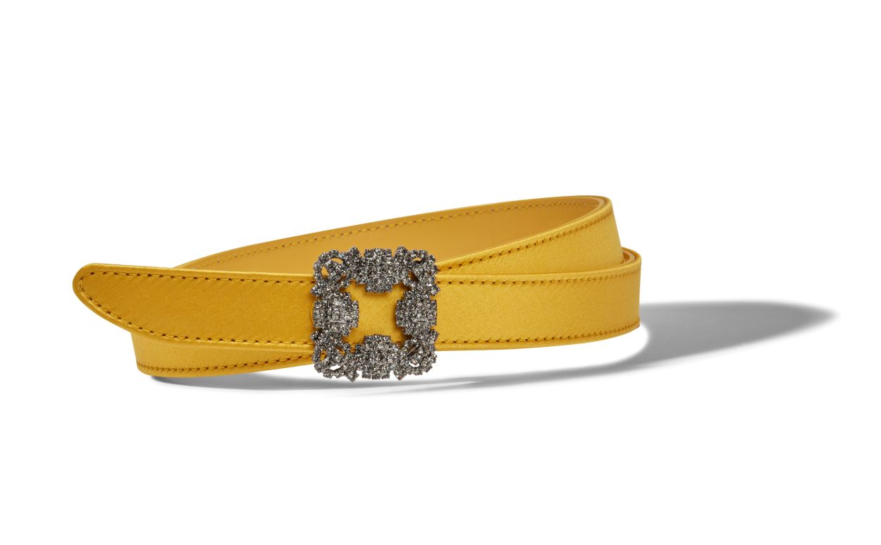 Yellow satin belt featuring narrow width design, moveable square crystal buckle encased in a gunmetal frame and push stud fastening. Upper: 68% viscose, 32% silk. Lining: 100% nappa leather. Made in Italy.