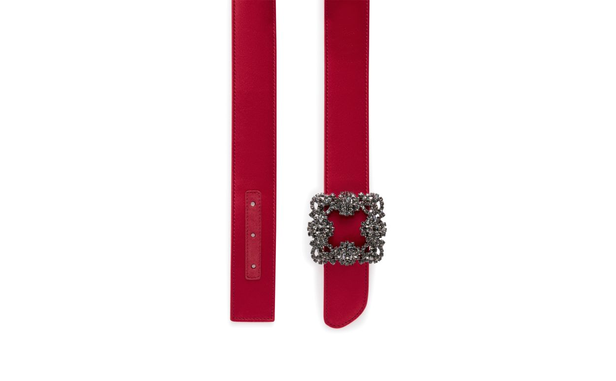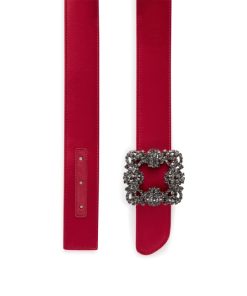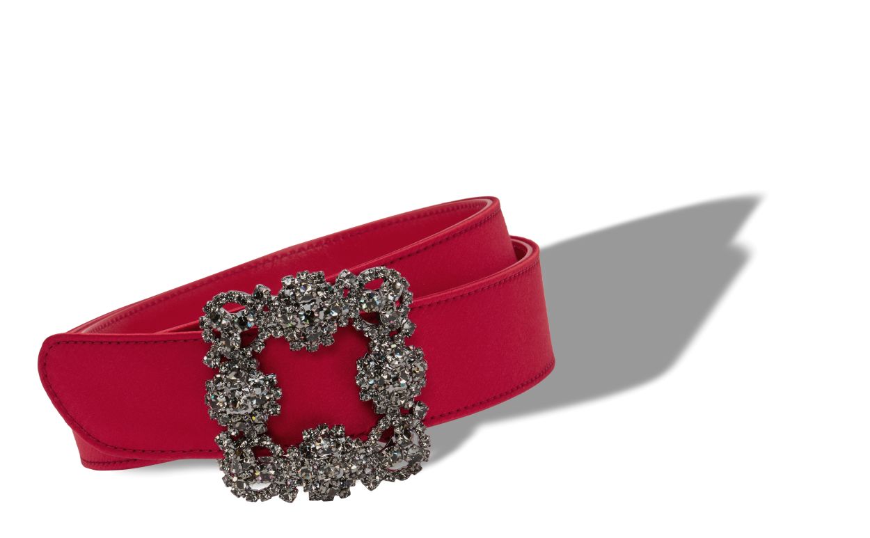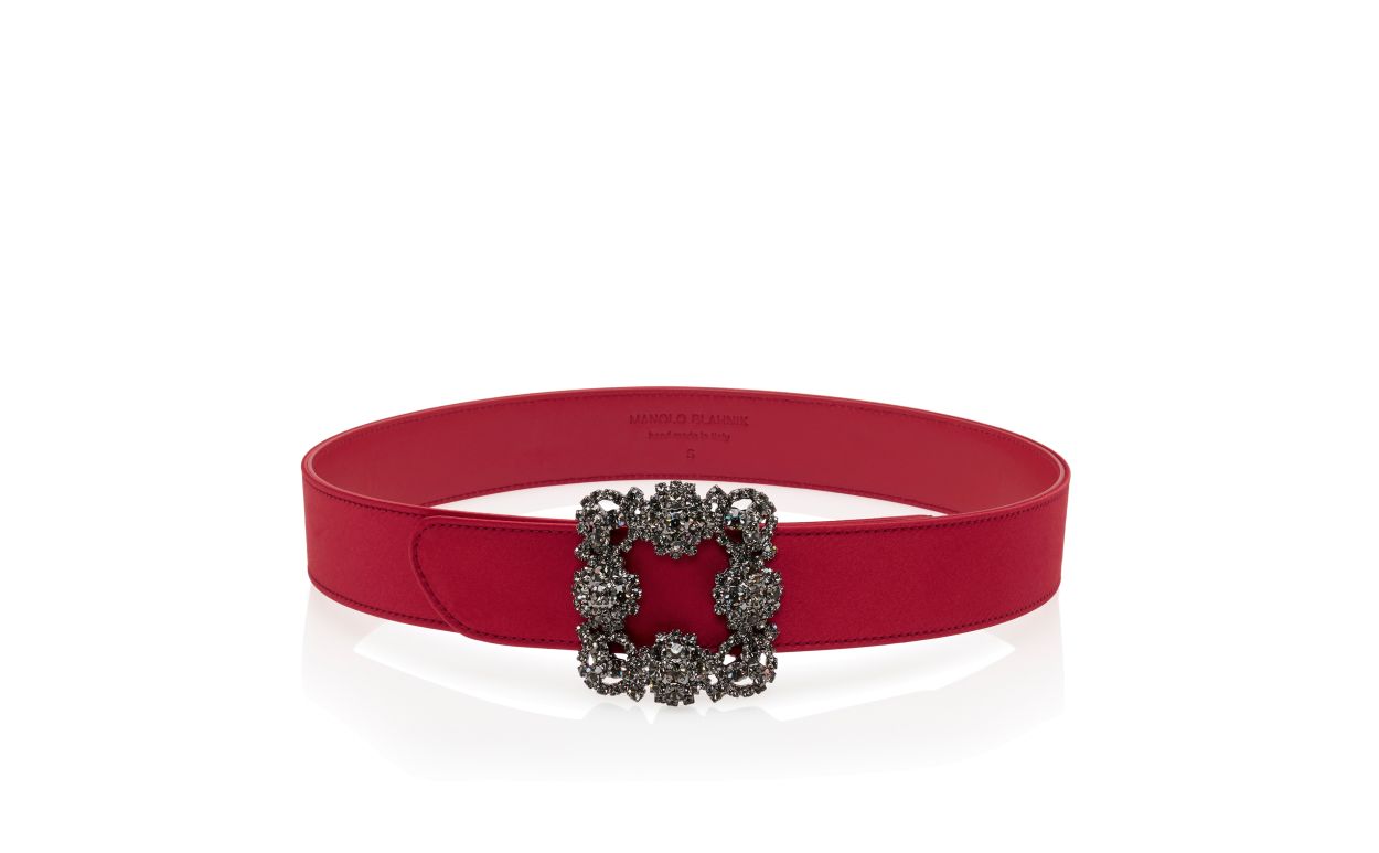 Red satin belt featuring a moveable square crystal buckle encased in a gunmetal frame, with a push stud fastening. Upper: 68% viscose, 32% silk. Lining: 100% nappa leather. Made in Italy.