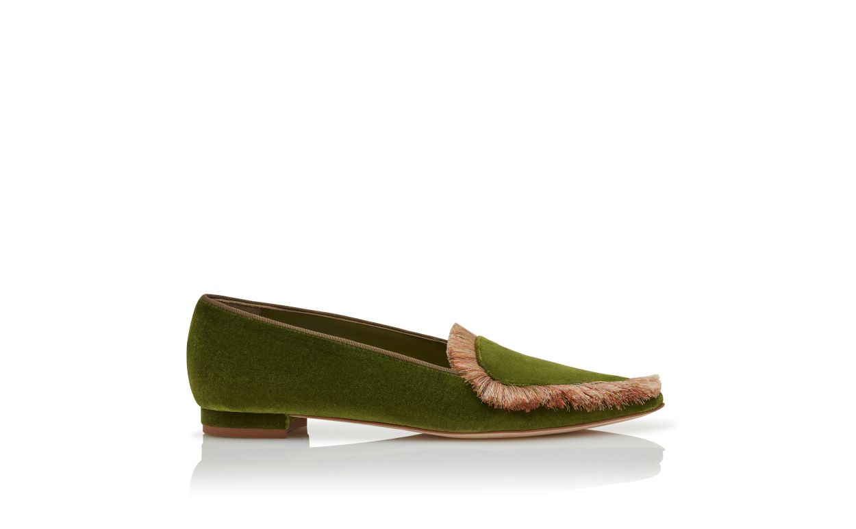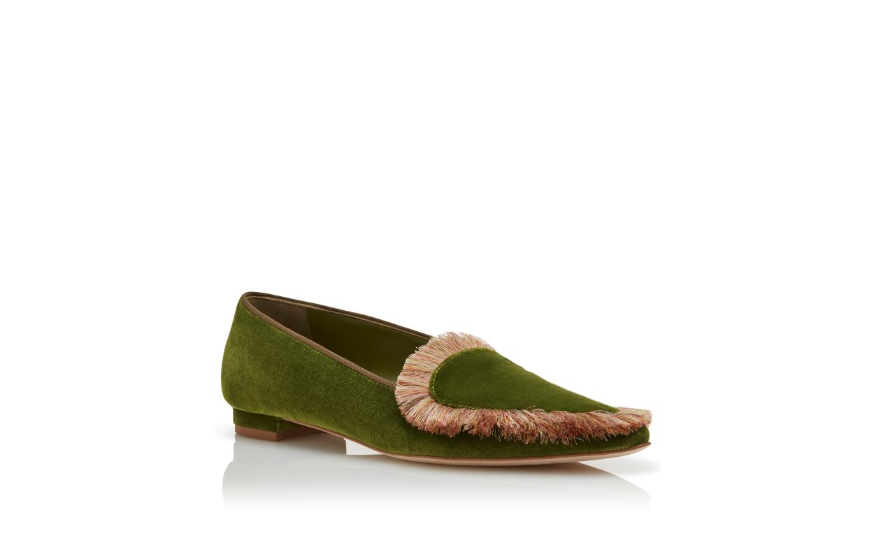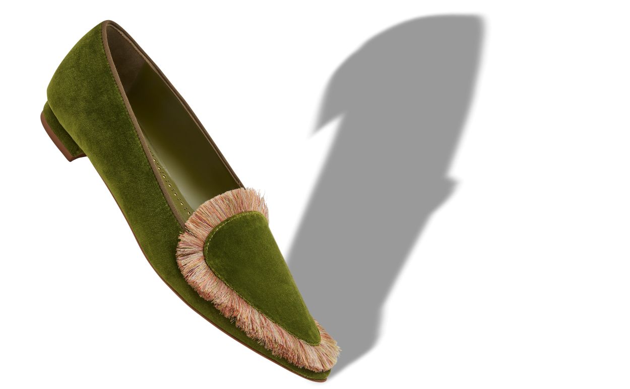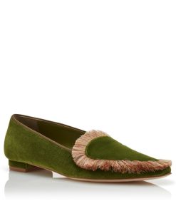 Green velvet round toe loafers featuring multicoloured fringing details and flat stacked heel.