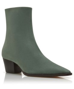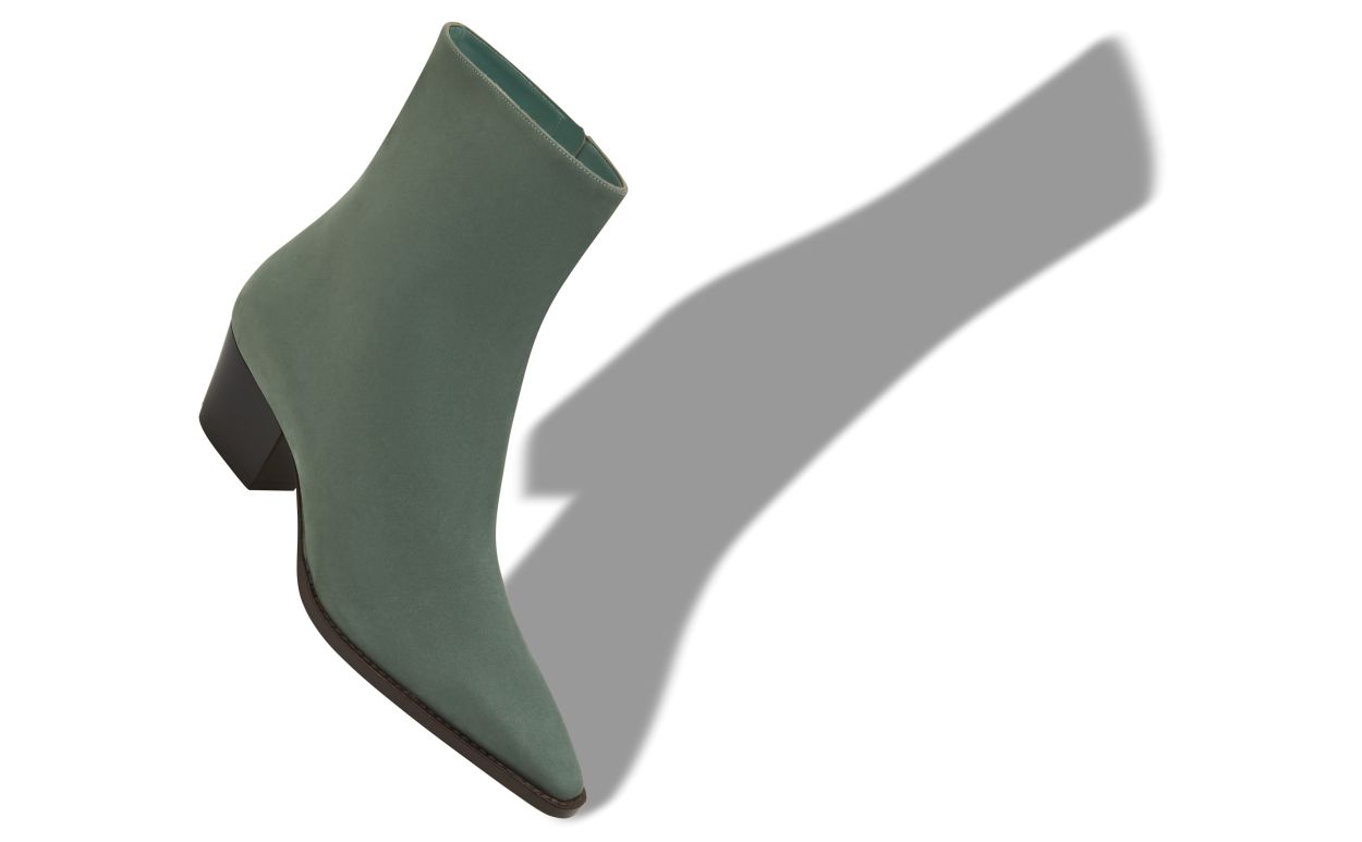 Green nubuck pointed toe ankle boots featuring black block low heel.