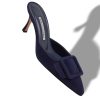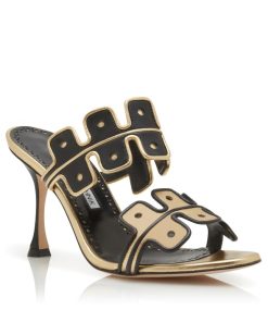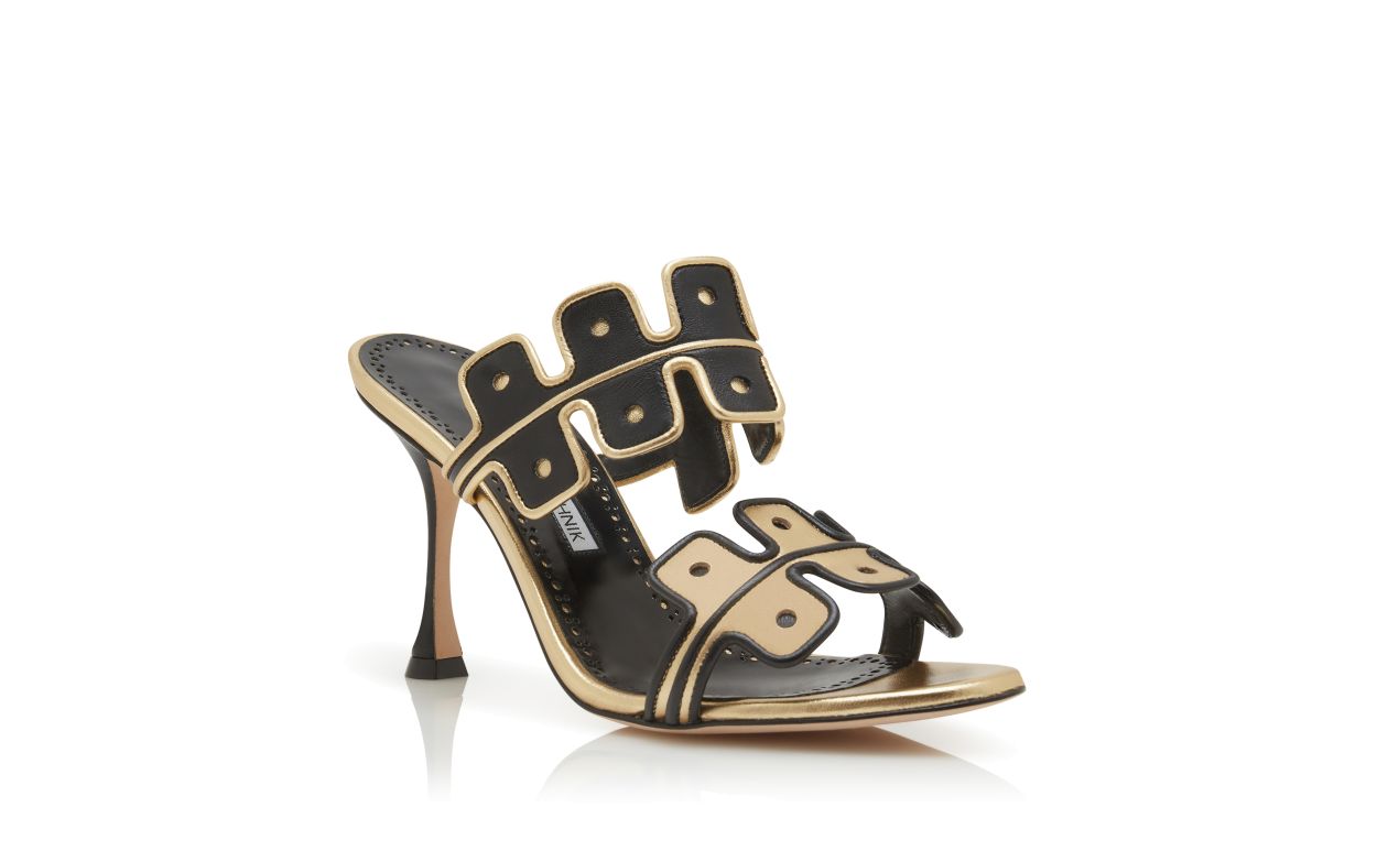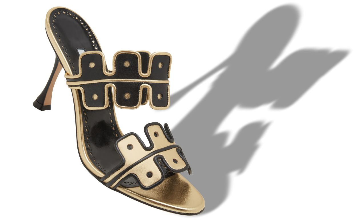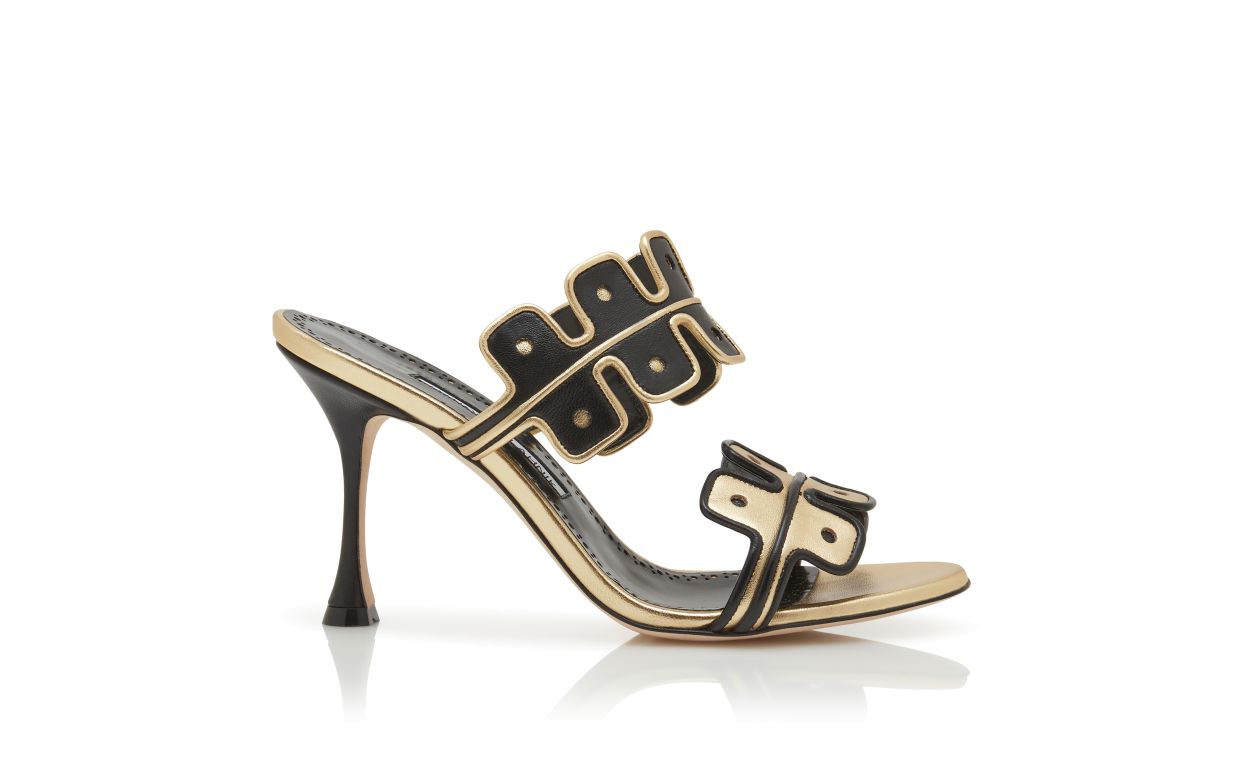 Black nappa leather open toe mules featuring gold scalloped instep and toe strap with gold and black edging. Finished with flared high heel.