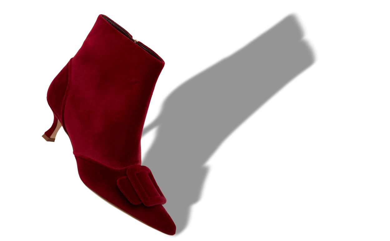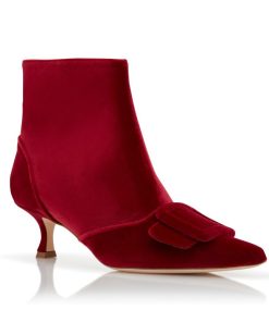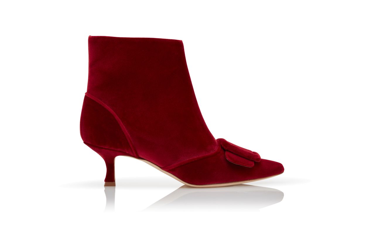 Red velvet pointed toe ankle boots featuring decorative buckle detail, side zip closure and stiletto low heel.Upper: 100% velvet. Sole: 100% calf leather. Lining: 100% kid leather.Heel measures 50 mm.Italian sizing.Made in Italy.