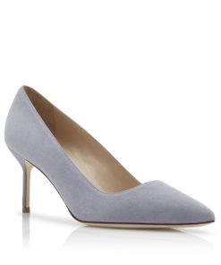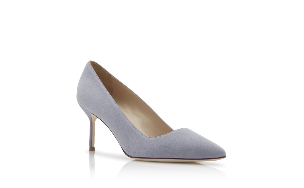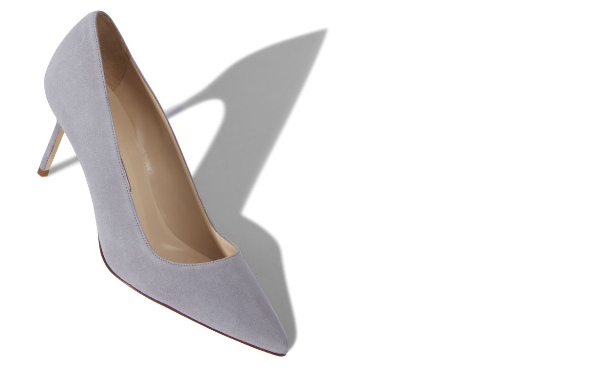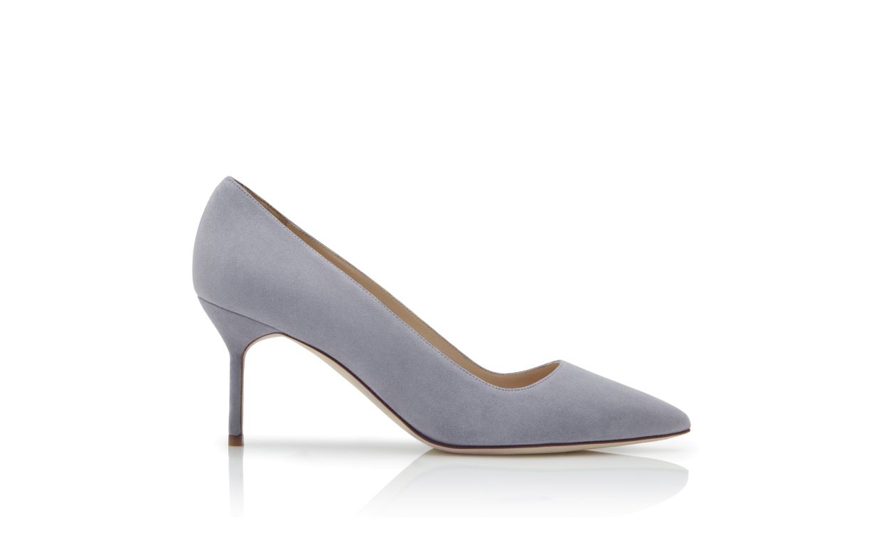 Light grey suede pointed toe court shoes with a stiletto mid heel. Upper: 100% calf suede. Sole: 100% cow leather. Lining: 100% kid leather. Heel measures 70 mm. Made in Italy.