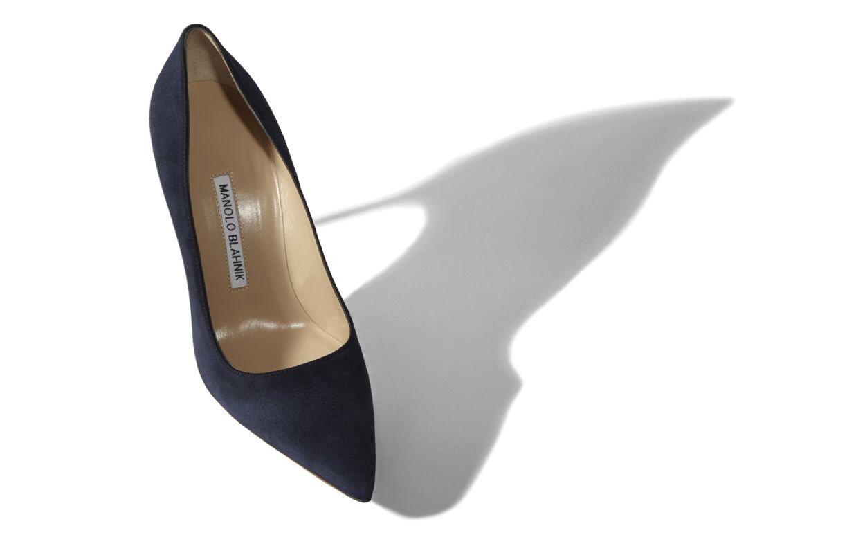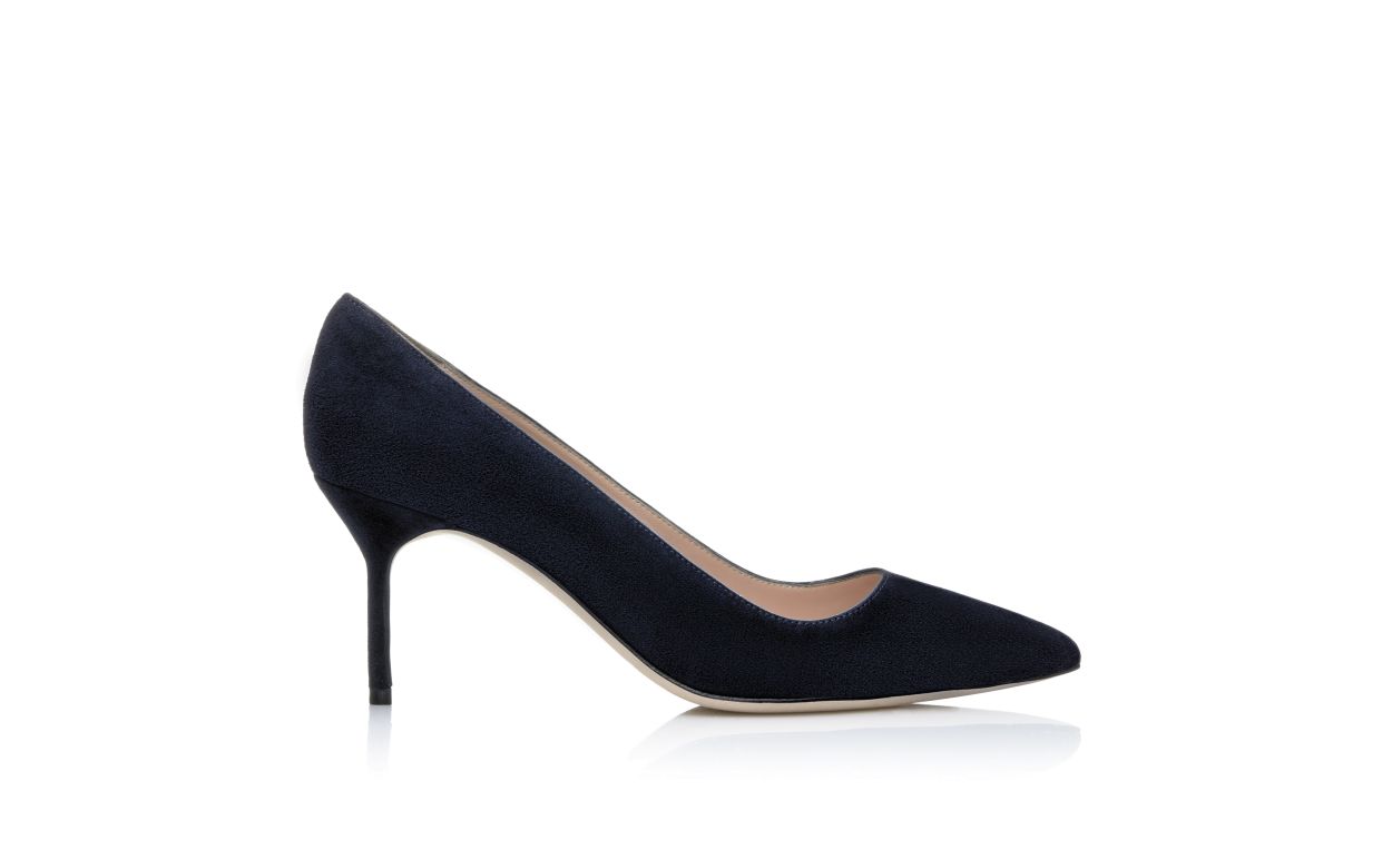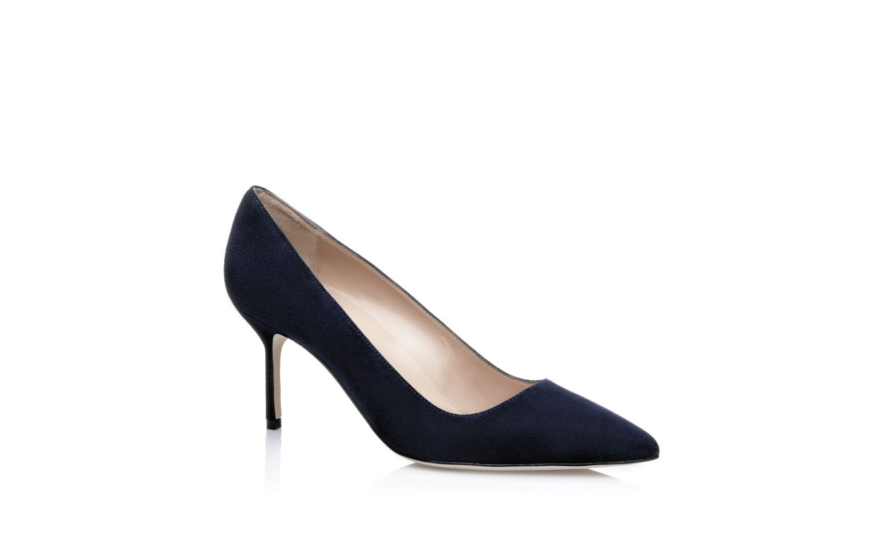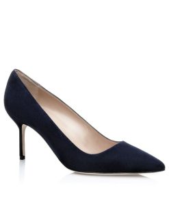 Navy suede pointed toe court shoes with a stiletto mid heel. Upper: 100% suede. Sole: 100% cow leather. Lining: 100% kid leather. Heel measures 70 mm. Made in Italy.