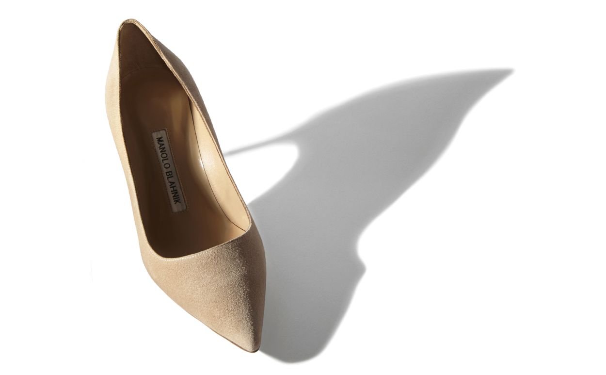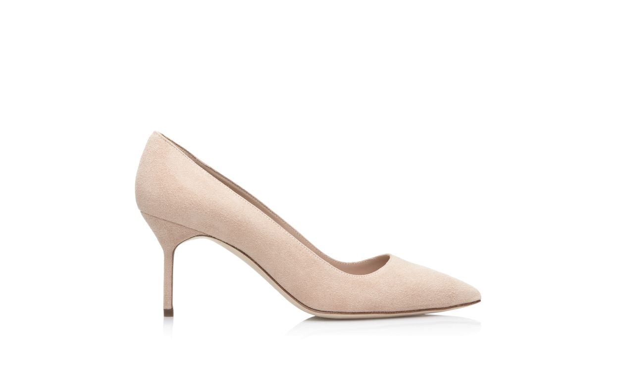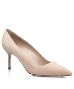 Nude suede pointed toe court shoes with a stiletto mid heel. Upper: 100% suede. Sole: 100% cow leather. Lining: 100% kid leather. Heel measures 70 mm. Made in Italy.
