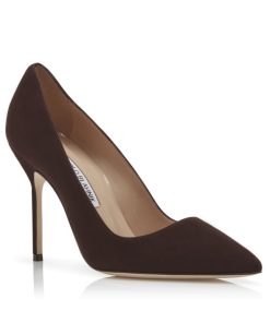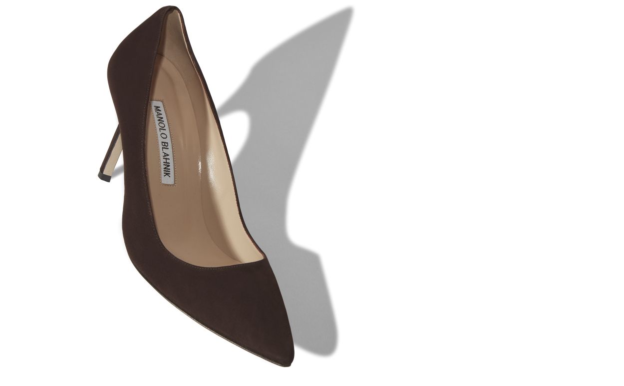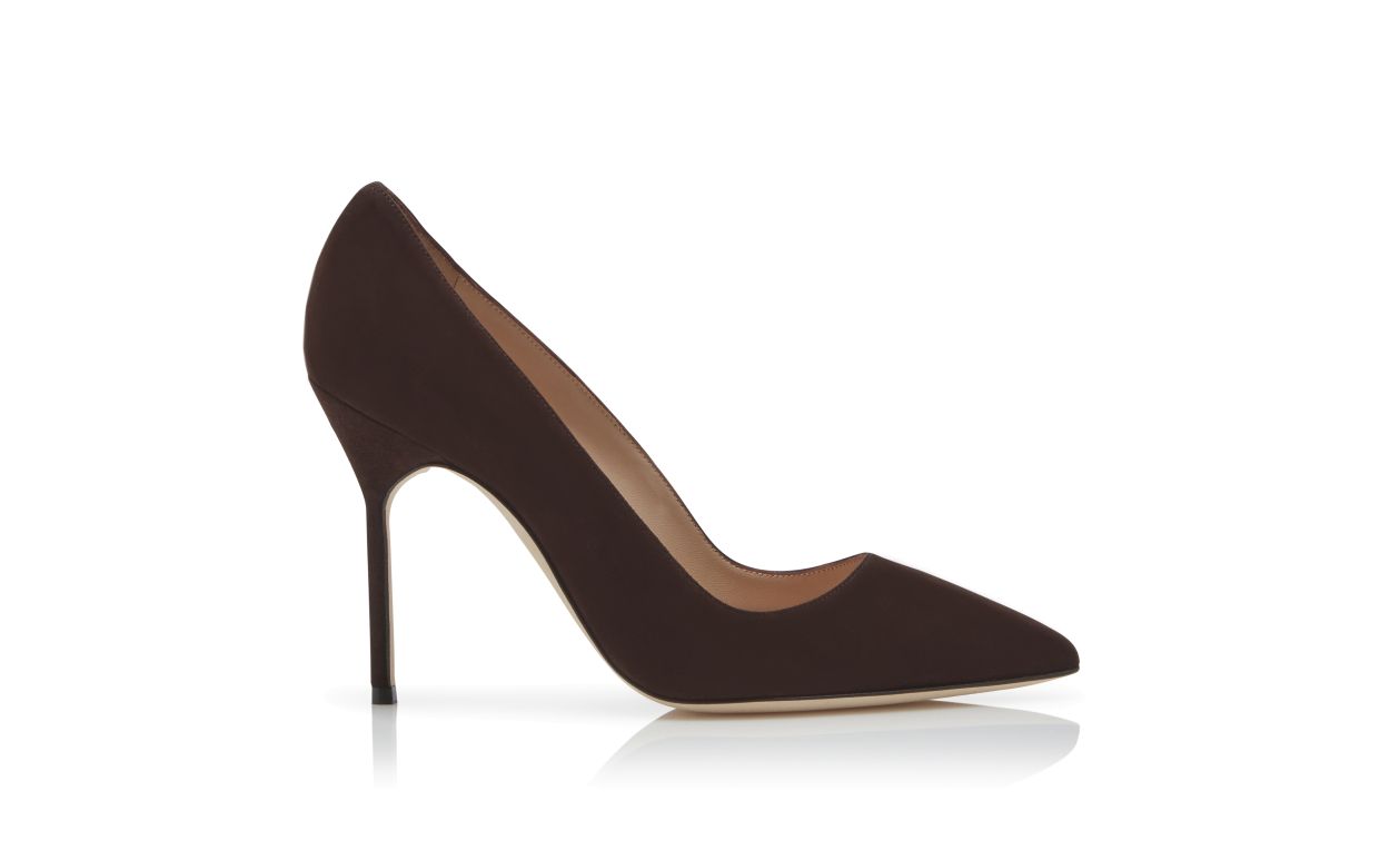 Chocolate brown pointed toe court shoes finished with a stiletto high heel. Upper: 100% calf suede. Sole: 100% cow leather. Lining: 100% kid leather. Heel measures 105 mm. Made in Italy.