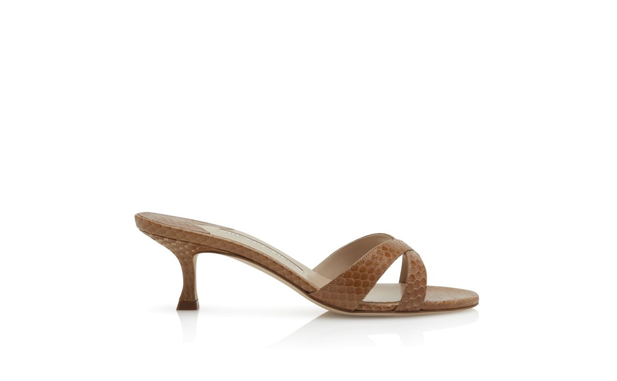 Brown snakeskin open toe mules featuring textured crossover straps and kitten heel.Upper: 100% snakeskin. Sole: 100% cow leather. Lining: 100% goat skin. Heel measures 50 mm. Italian Sizing. Made in Italy.