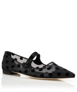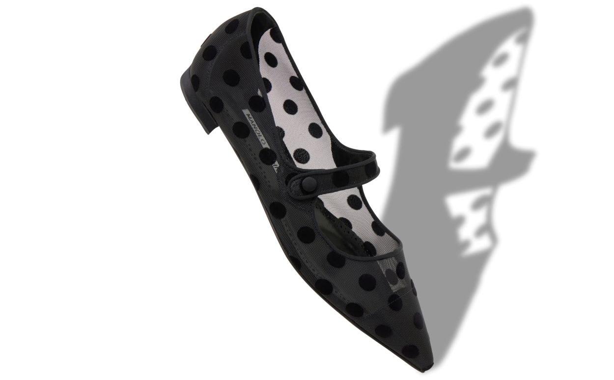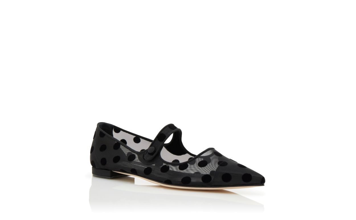 Black mesh pointed toe Mary Jane flat pumps featuring black polka dot detail, black grosgrain edging and front strap with black button closure.Finished with black counter, toe point and flat stacked heel.Upper: 80% polyamide, 10% viscose, 10% silk. Sole: 100% calf leather. Lining: 100% kid leather. Heel measures 10 mm. Italian sizing. Made in Italy.