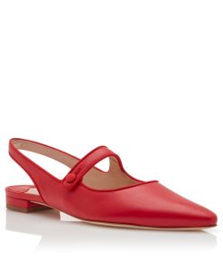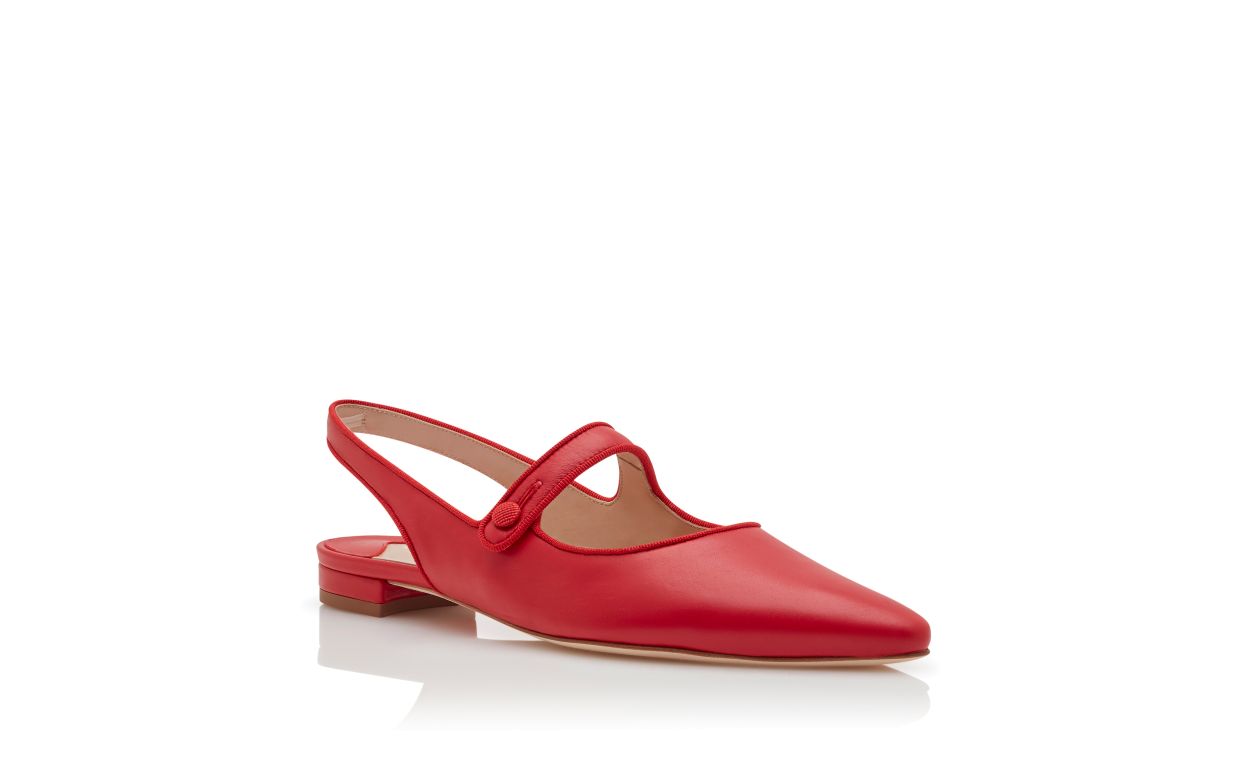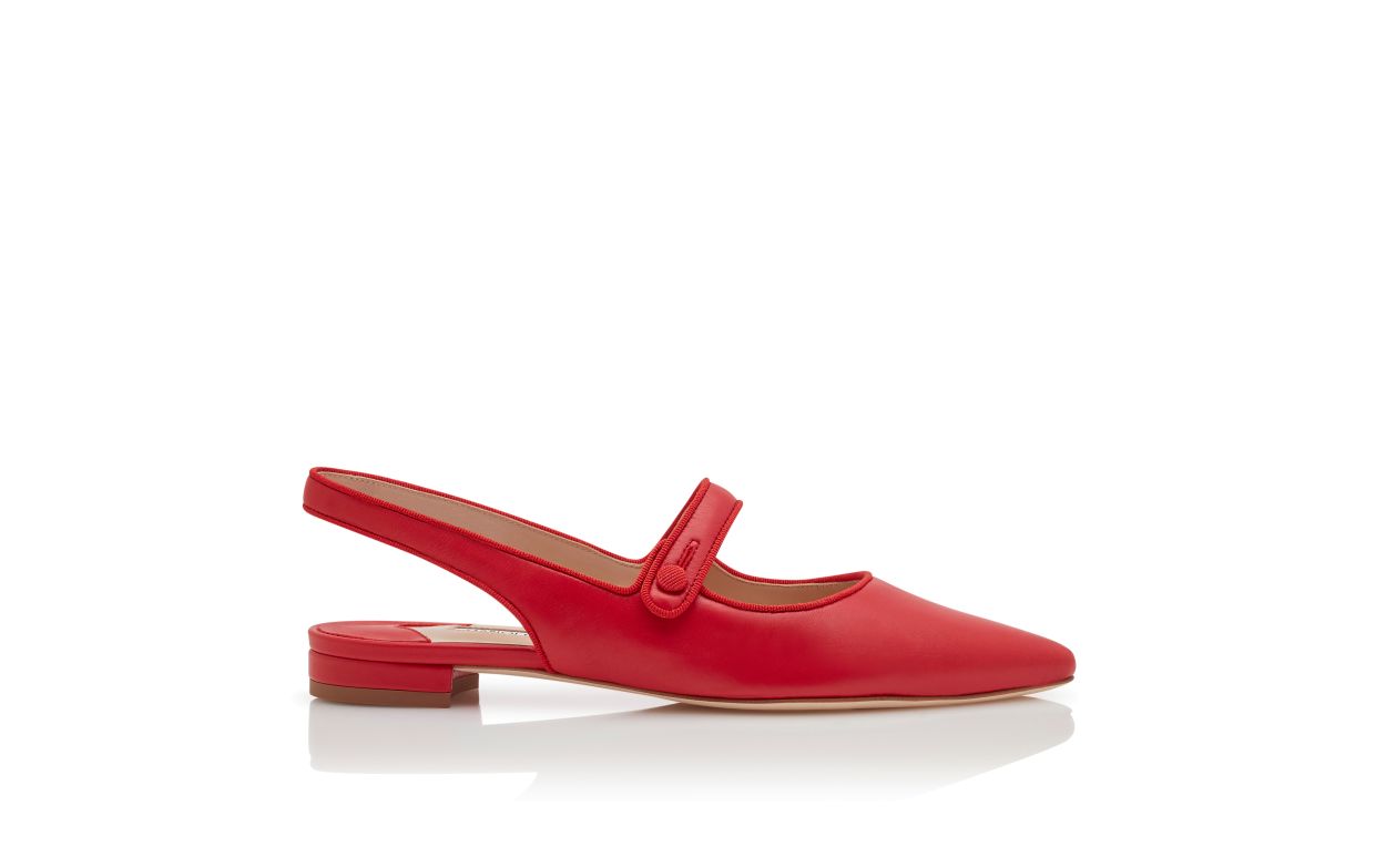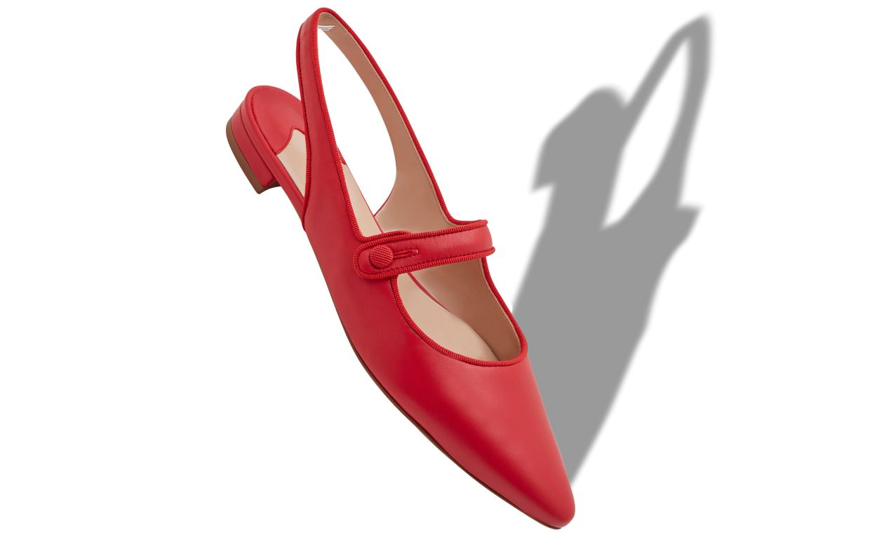 Red nappa leather pointed toe Mary Jane flat pumps featuring red grosgrain edging, front strap with button closure and slingback design. Finished with flat stacked heel.Upper: 100% lamb nappa. Sole: 100% calf leather. Lining: 100% kid leather. Heel measures 10 mm. Italian sizing. Made in Italy.