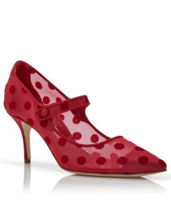 Red mesh pointed toe Mary Jane pumps featuring red polka dot detail, red grosgrain edging and front strap with red button closure.Finished with red counter, toe point and flat stacked heel.Upper: 80% polyamide, 10% viscose, 10% silk. Sole: 100% calf leather. Lining: 100% kid leather. Heel measures 70 mm. Italian sizing. Made in Italy.