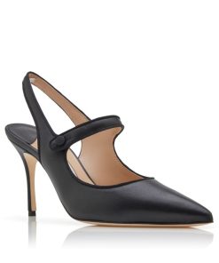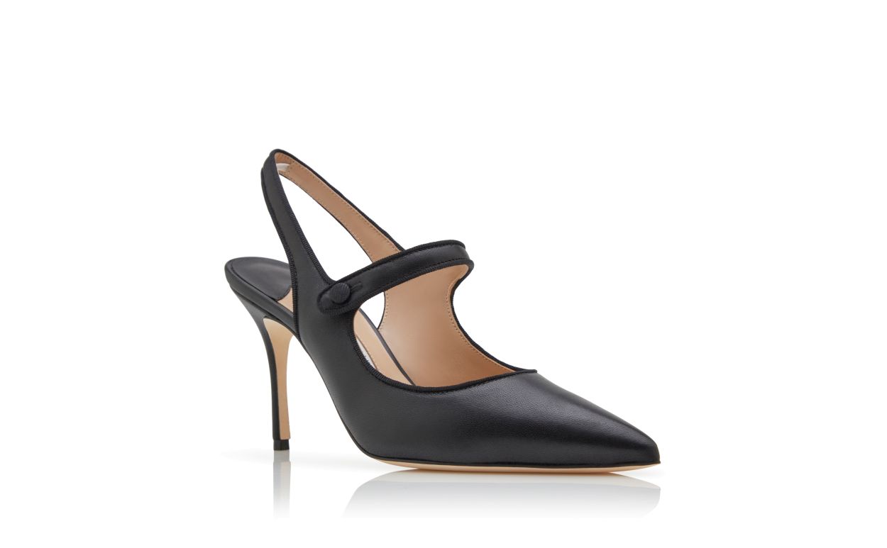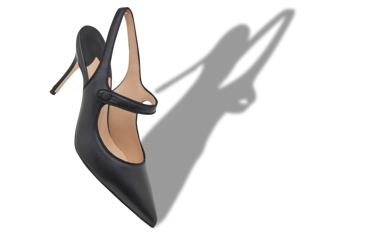 Black nappa leather pointed toe Mary Jane pumps featuring black grosgrain edging, front strap with button closure and slingback design. Finished with stiletto high heel.Upper: 100% lamb nappa. Sole: 100% calf leather. Lining: 100% kid leather. Heel measures 90 mm. Italian sizing. Made in Italy.