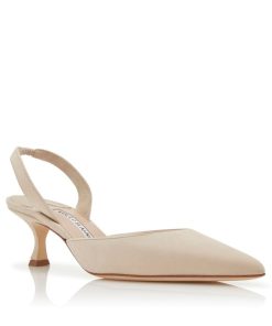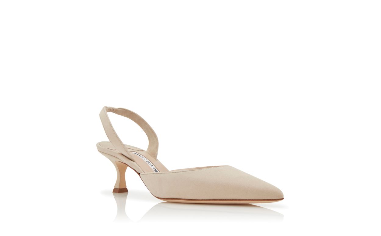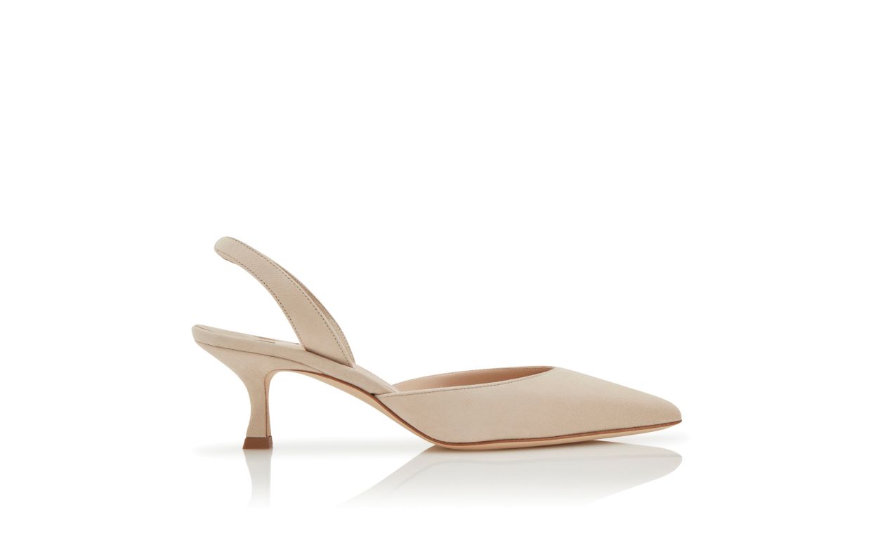 Light beige suede almond toe slingback pumps finished with a stiletto low heel. Upper: 100% kid suede. Sole: 100% calf leather. Lining: 100% kid leather.Heel measures 50 mm. Italian sizing. Made in Italy.