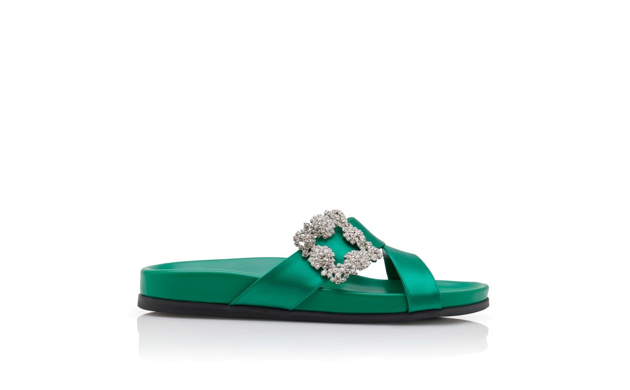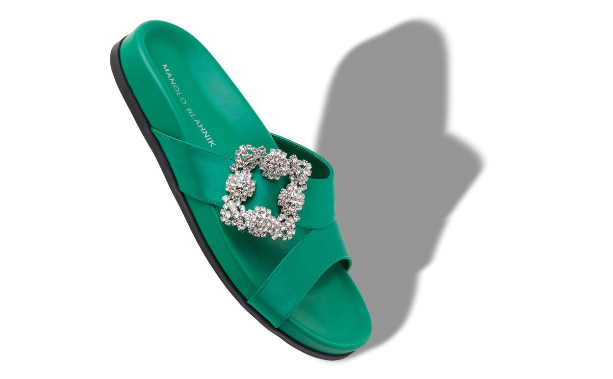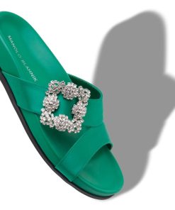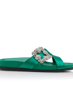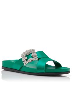 Green satin open toe flat mules featuring crossover straps with decorative clear crystal jewel buckle. Finished with flat rubber sole. Upper: 72% viscose, 28% silk. Sole: 100% rubber. Lining: 100% kid leather.Heel measures 10 mm.Italian sizing.Made in Italy.