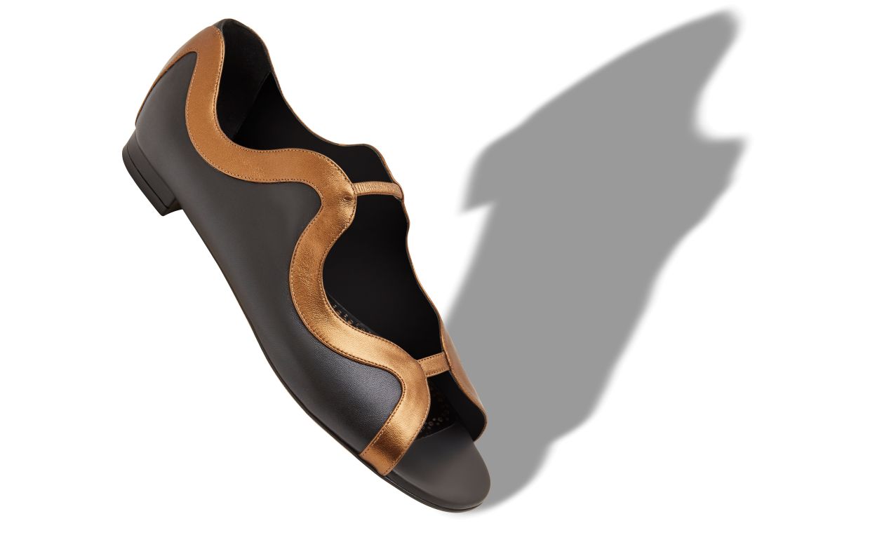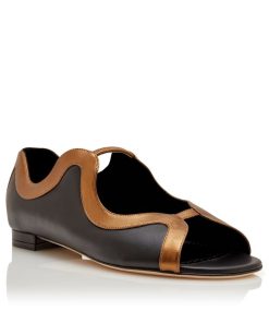 Black nappa leather open toe sandals featuring bronze scalloped design and flat stacked heel.