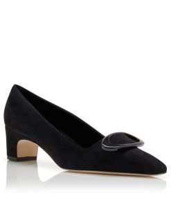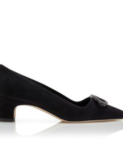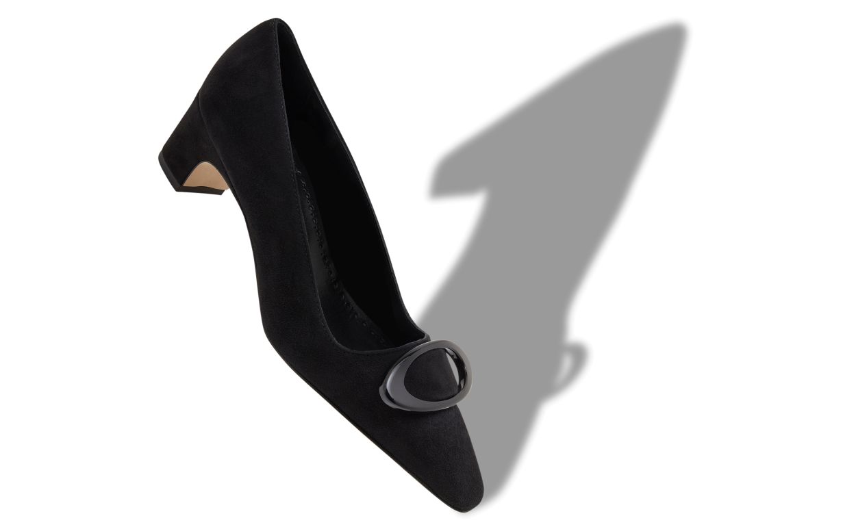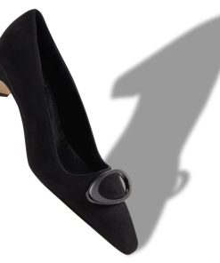 Black suede pointed toe pumps featuring circular buckle and low block heel.Upper: 100% kid suede. Sole: 100% calf leather. Lining: 100% kid leather. Heel measures 50 mm. Italian sizing. Made in Italy.