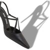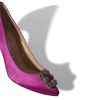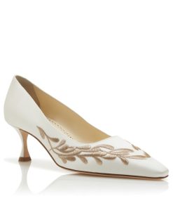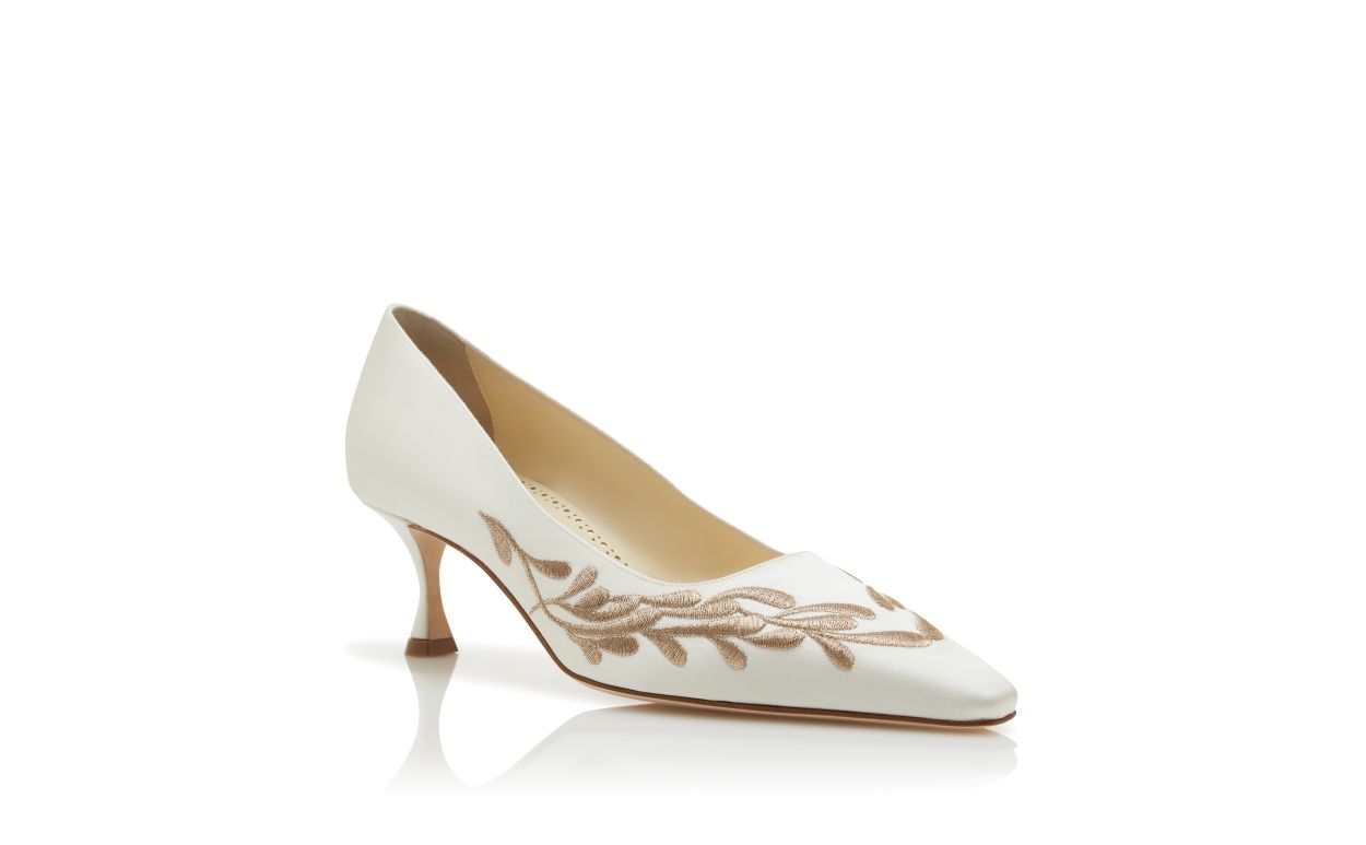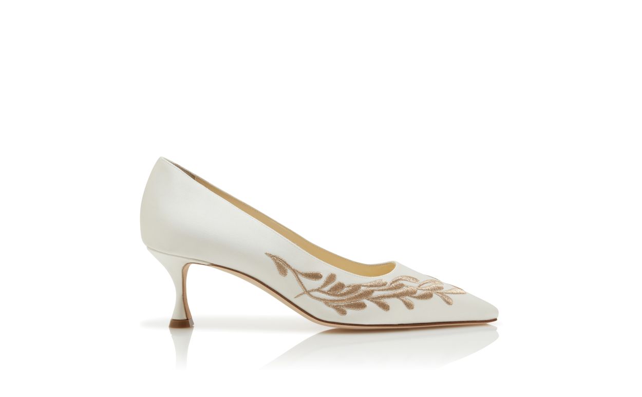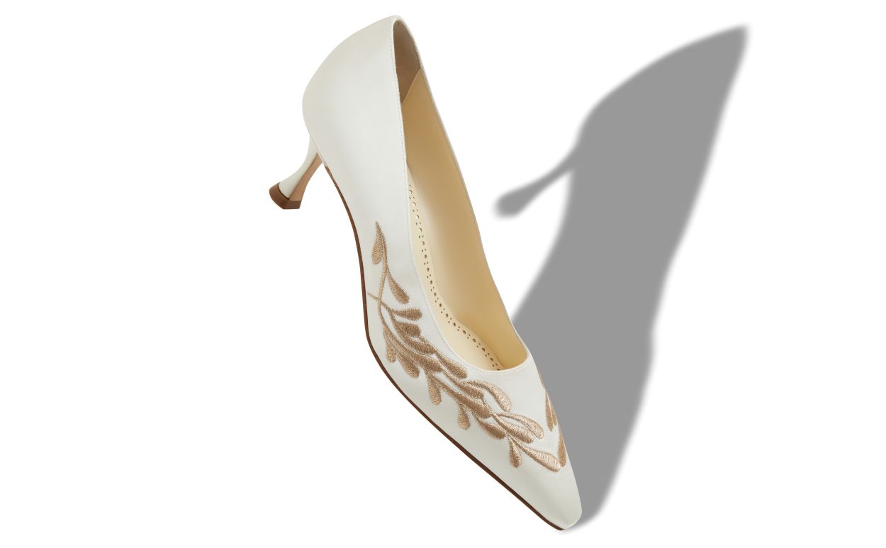 White satin pointed toe pumps featuring embroidered gold cascading leaf design. Finished with flared low heel.