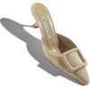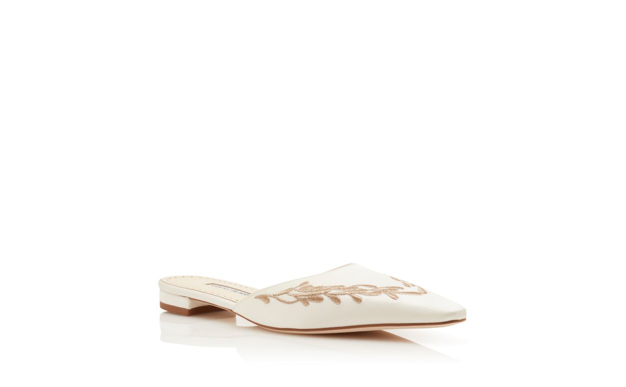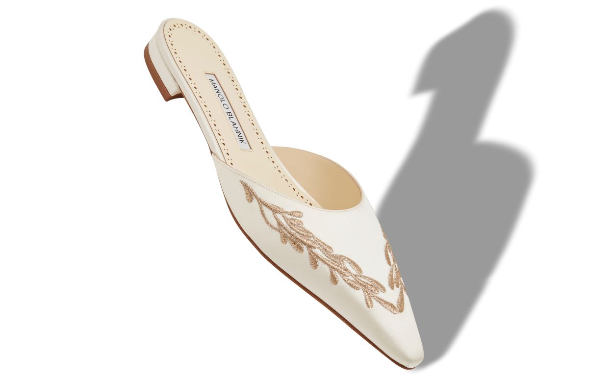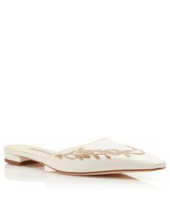 White satin pointed toe flat mules featuring embroidered gold cascading leaf design. Finished with flat stacked heel