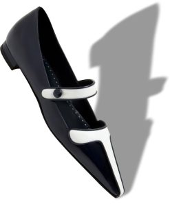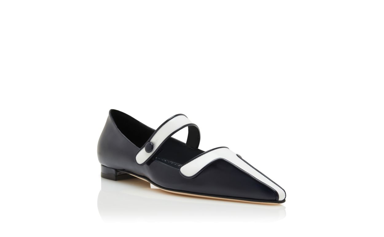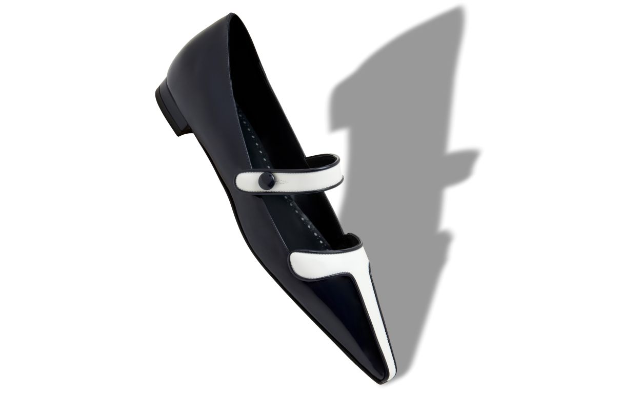Navy blue patent leather pointed toe Mary Jane flat pumps featuring white patent leather front strap with navy blue button closure. Finished with flat stacked heel.