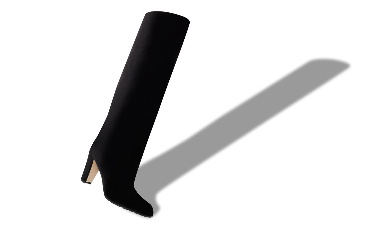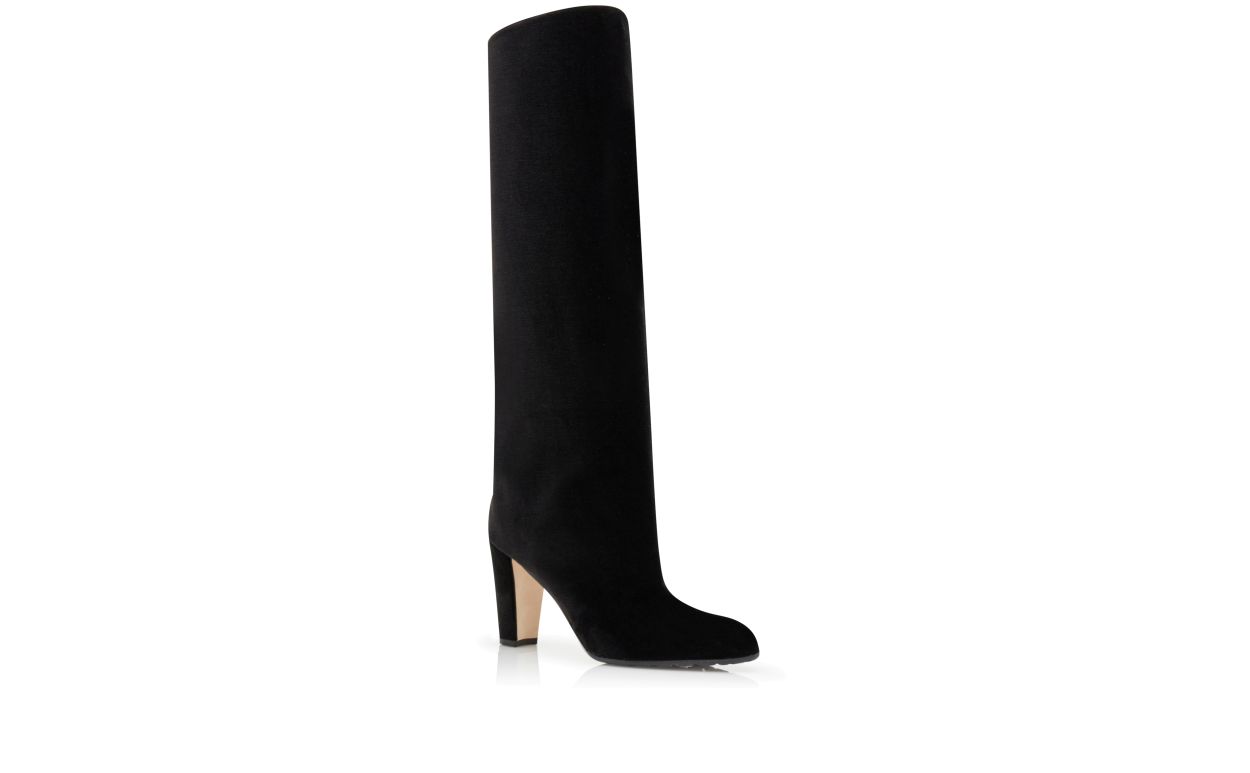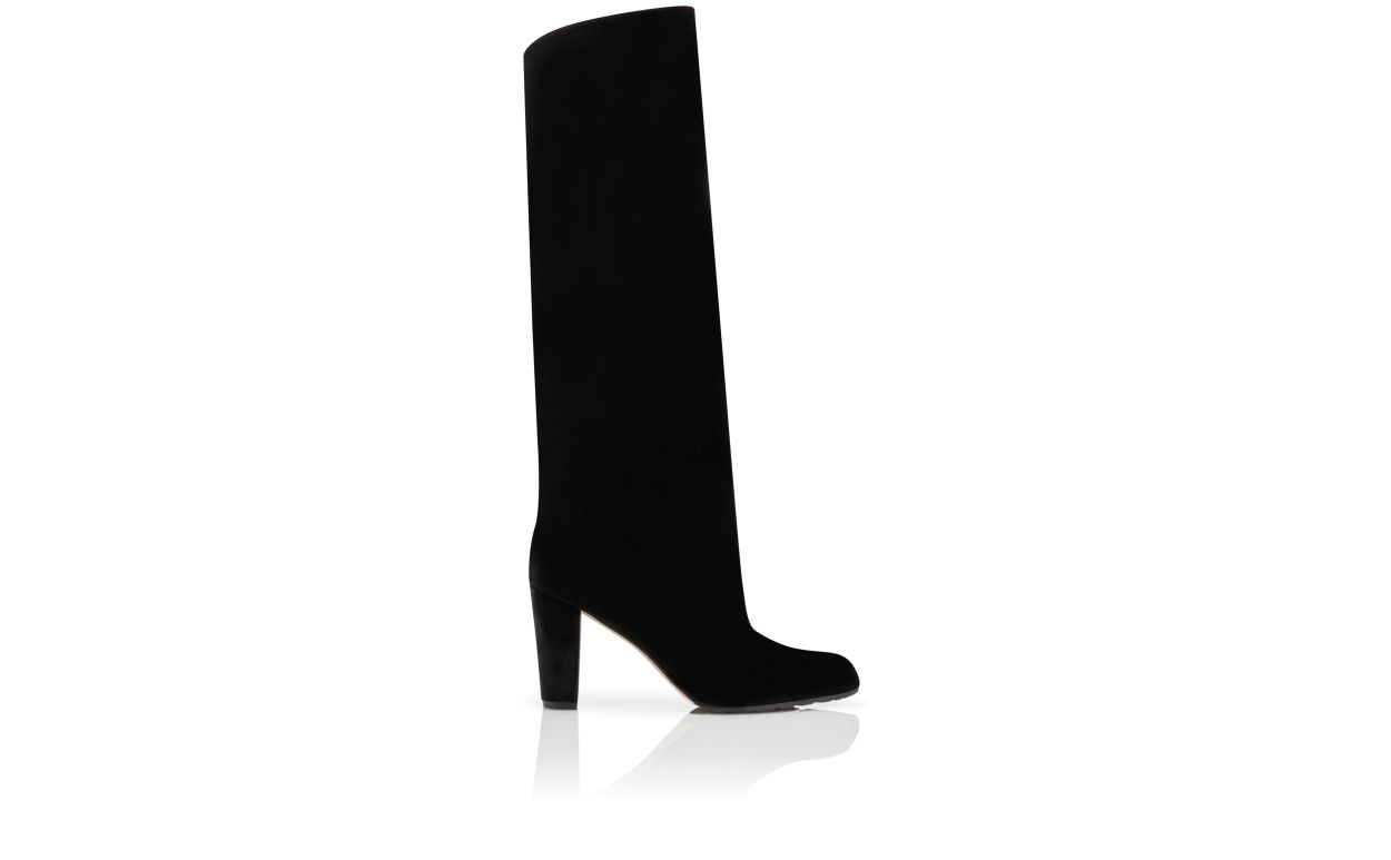 Black velvet round toe knee high boots featuring slip-on design and block high heel with rubber sole.Upper: 100% velvet. Sole: 50% calf leather, 50% rubber. Lining: 100% kid leather.Heel measures 90 mm.Italian sizing.Made in Italy.