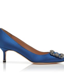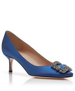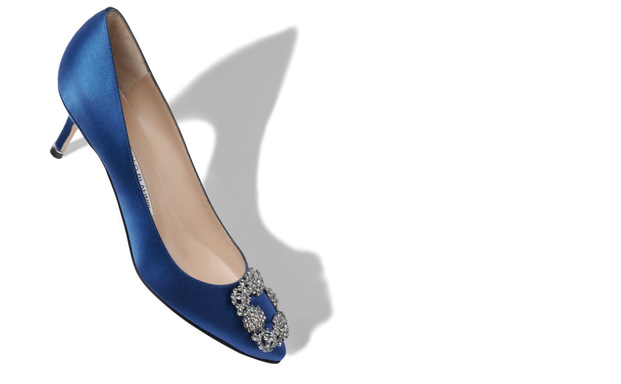 Blue satin almond toe pumps featuring a square crystal buckle encased in a gunmetal frame. Finished with a stiletto kitten heel. Upper: 68% viscose, 32% silk. Sole: 100% cow leather. Lining: 100% kid leather. Heel measures 50 mm. Italian sizing. Made in Italy.