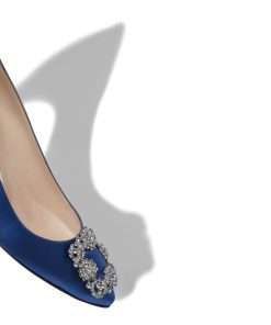 Blue satin almond toe pumps featuring a square crystal buckle encased in a gunmetal frame. Finished with a stiletto kitten heel. Upper: 68% viscose, 32% silk. Sole: 100% cow leather. Lining: 100% kid leather. Heel measures 50 mm. Italian sizing. Made in Italy.