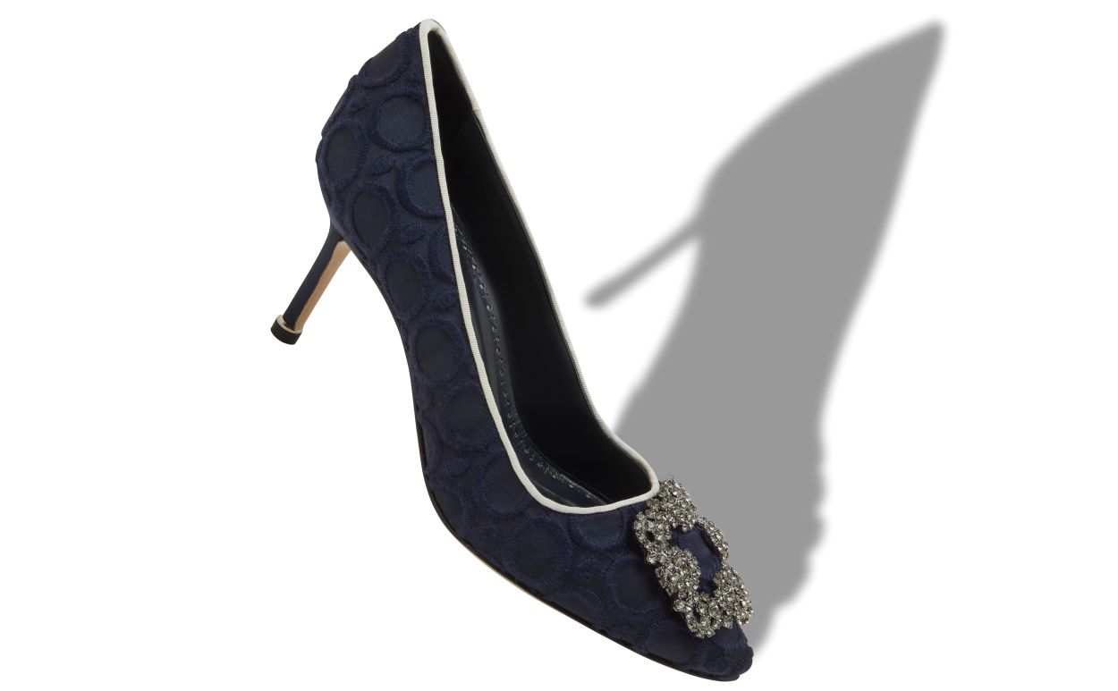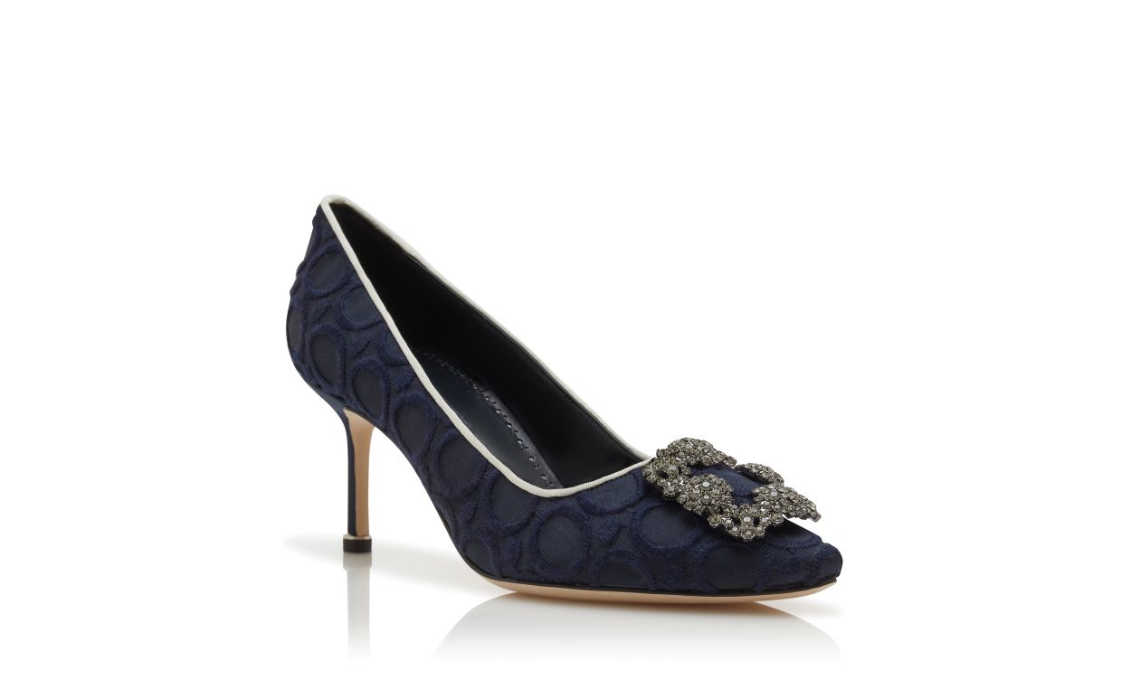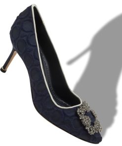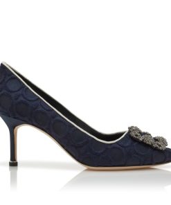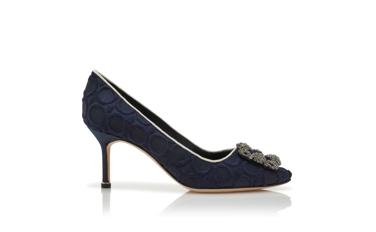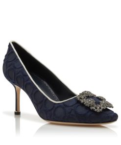 Manolo Blahnik Women’s Style Hangisi 70 | Navy Blue Silk Jewel Buckle Pumps