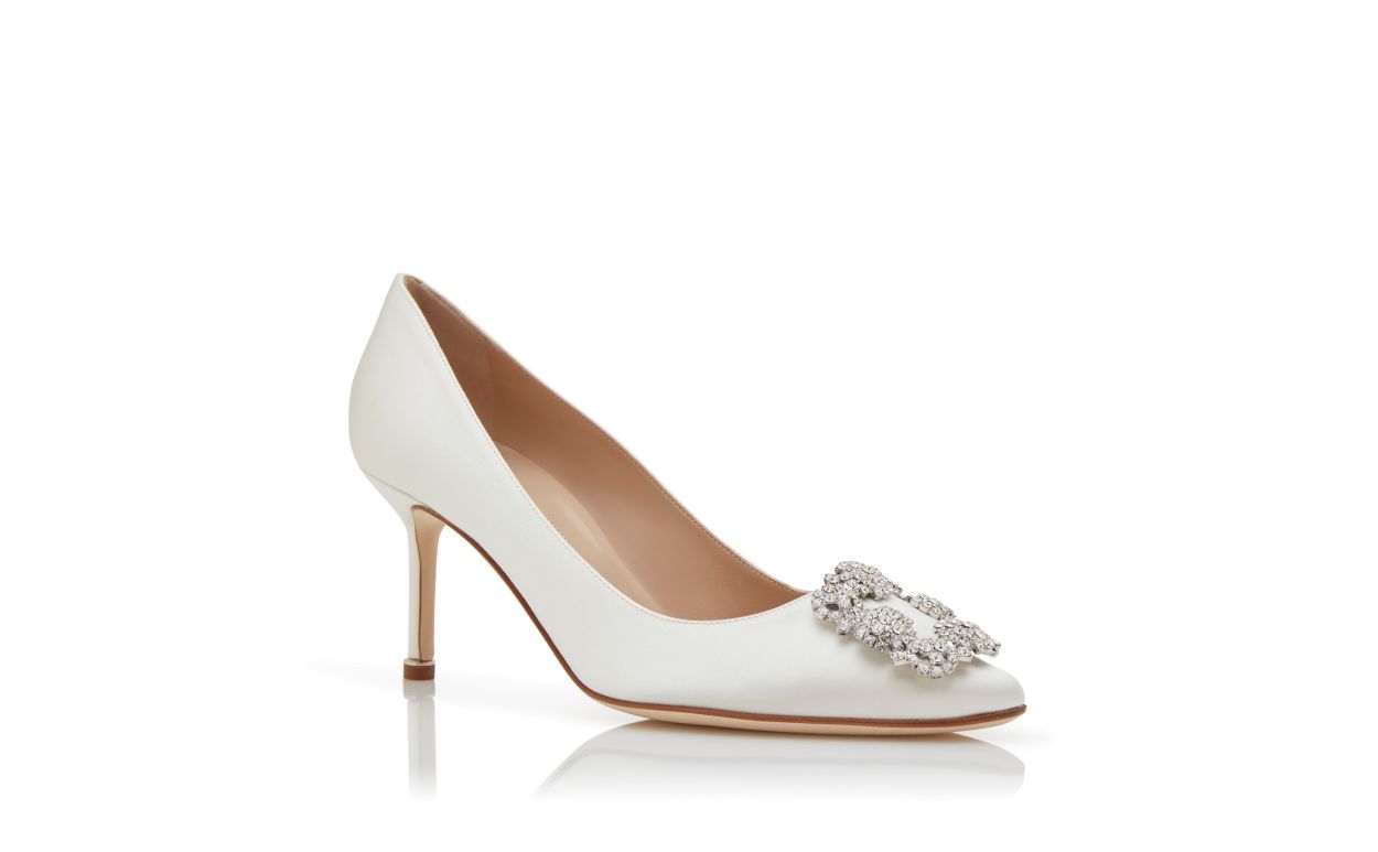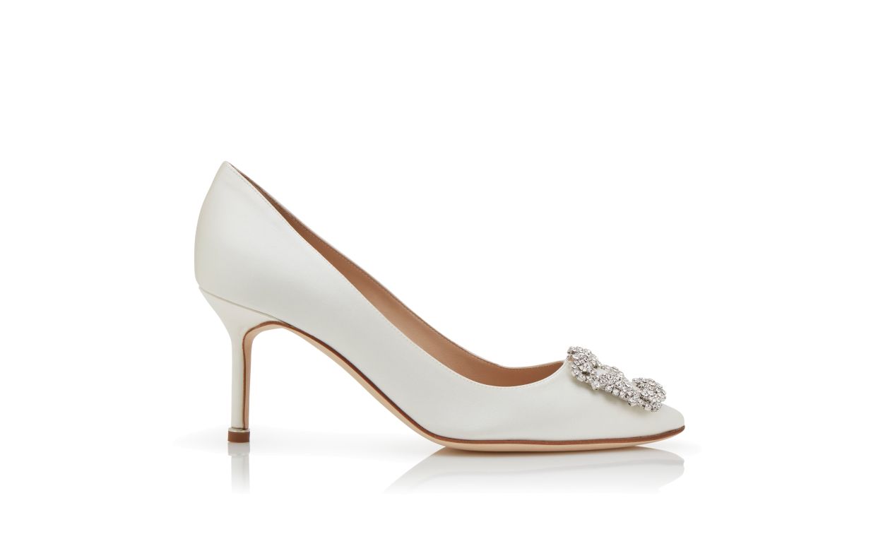 Off-white satin almond toe pumps featuring a square crystal buckle and stiletto mid heel. Upper: 72% viscose, 28% silk. Sole: 100% calf leather. Lining: 100% kid leather. Heel measures 70 mm. Italian sizing. Made in Italy.