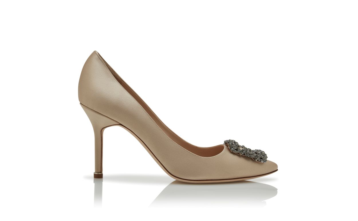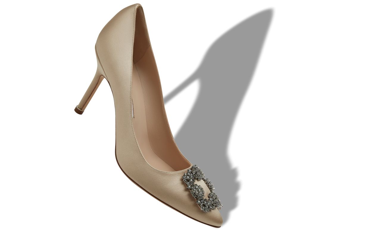 Light beige satin almond toe pumps featuring a square crystal buckle encased in a gunmetal frame and finished with stiletto high heel. Upper: 72% viscose, 28% silk. Sole: 100% calf leather. Lining: 100% kid leather. Heel measures 90 mm. Italian sizing. Made in Italy.