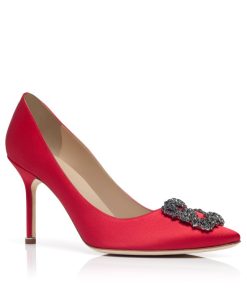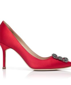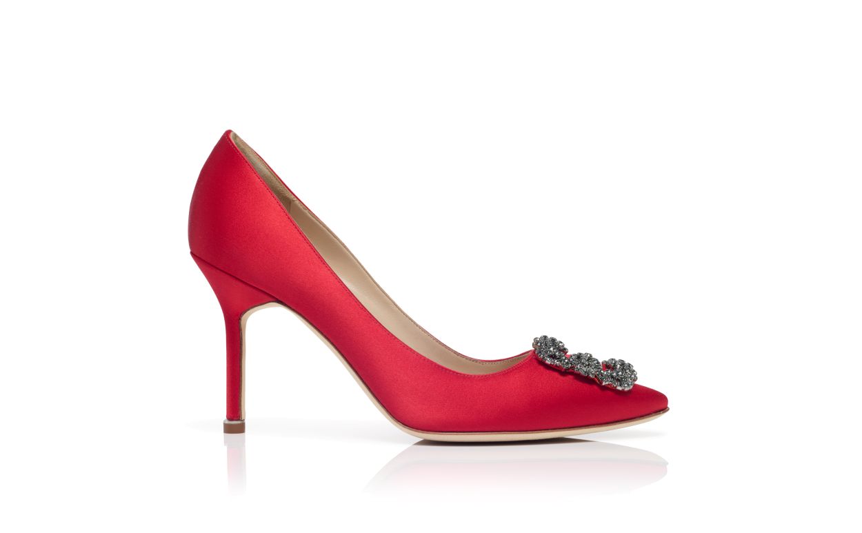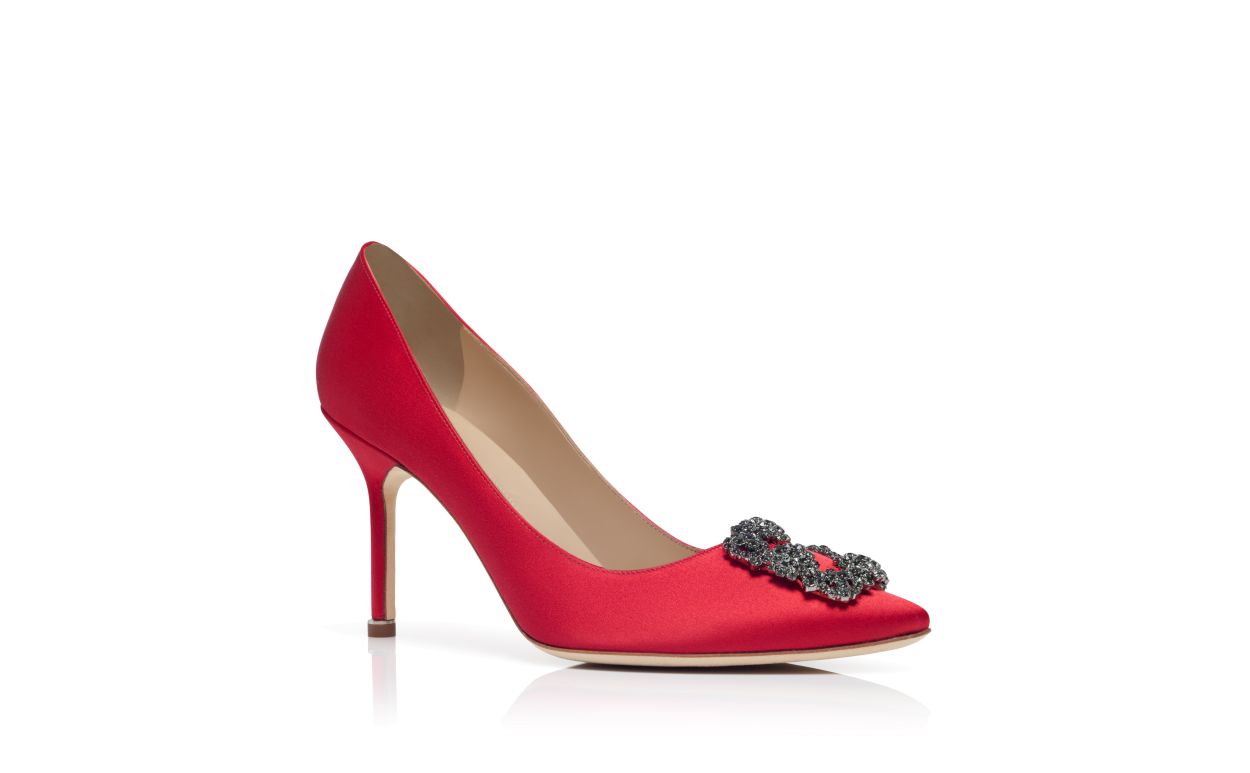 Red satin almond toe pumps featuring a square crystal buckle encased in a gunmetal frame. Finished with a stiletto high heel. Upper: 72% viscose, 28% silk. Sole: 100% calf leather. Lining: 100% kid leather. Heel measures 90 mm. Italian sizing. Made in Italy.
