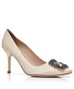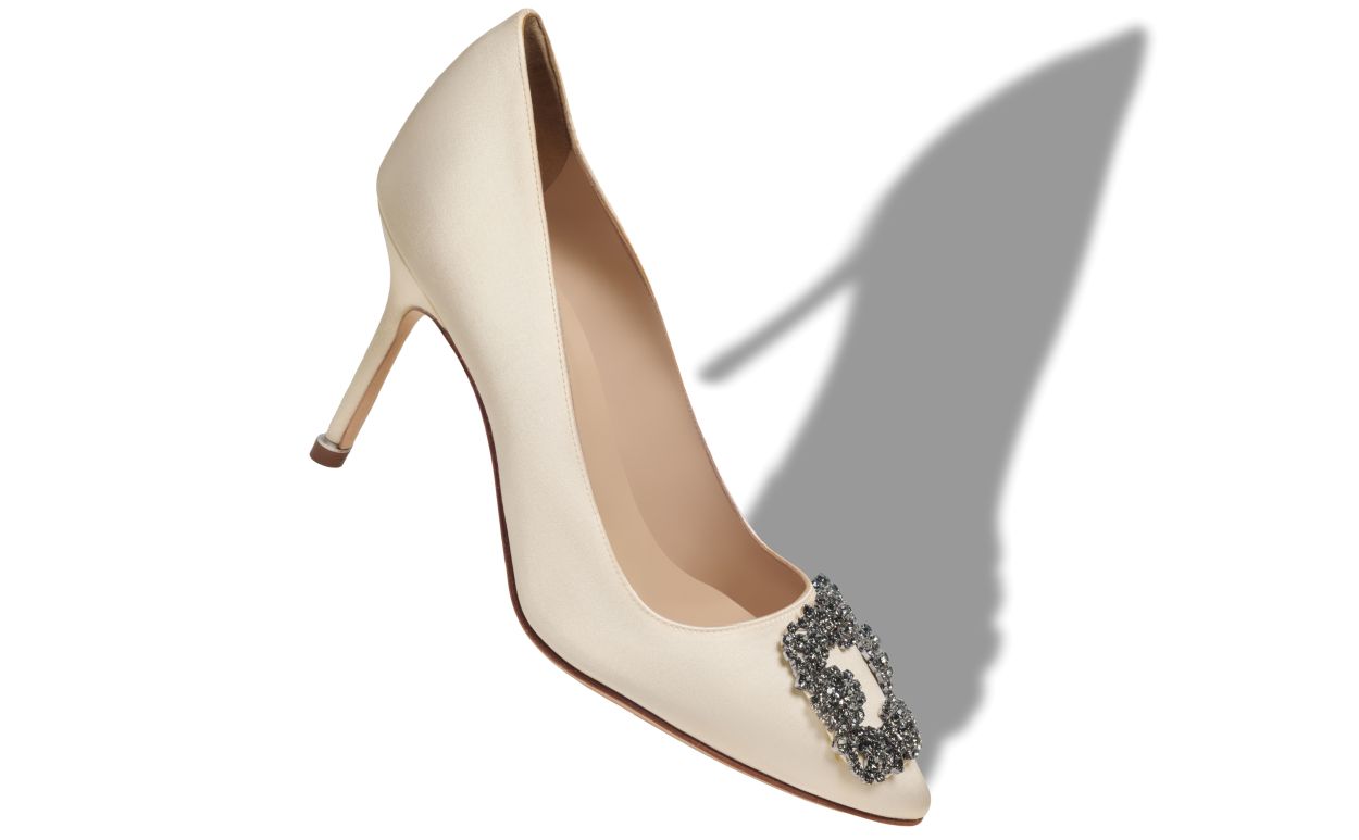 White satin almond toe pumps featuring a square crystal buckle encased in a gunmetal frame. Finished with a stiletto high heel. Upper: 72% viscose, 28% silk. Sole: 100% calf leather. Lining: 100% kid leather. Heel measures 90 mm. Italian sizing. Made in Italy.
